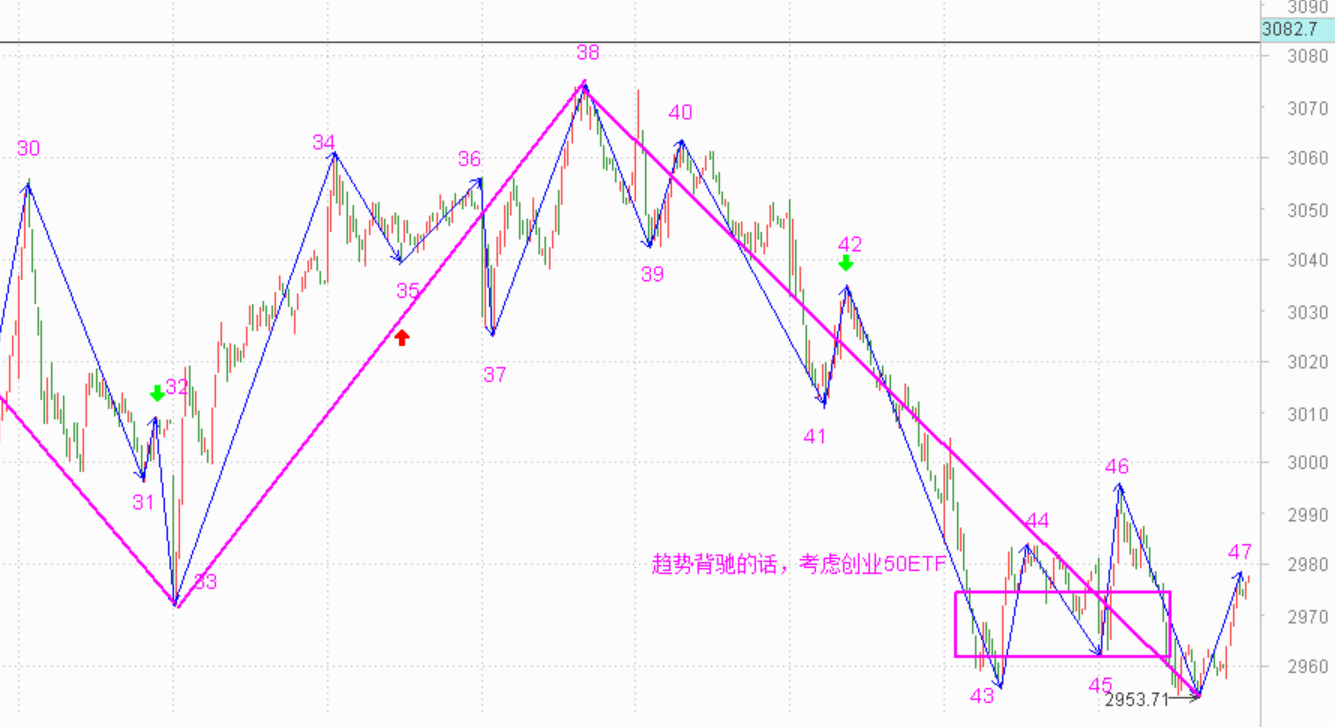 创业板今天是标准的趋势底背驰,可惜的是,我即使写在了那里,还是没买指数基金,看到了,犹豫了一下,瞬间就拉起来了,只接回一些半导体。下周前两天创业板应该会走出一个上行走势,高点就在前面的3070附近,三四个点吧,估计大概率是个盘整走势了。