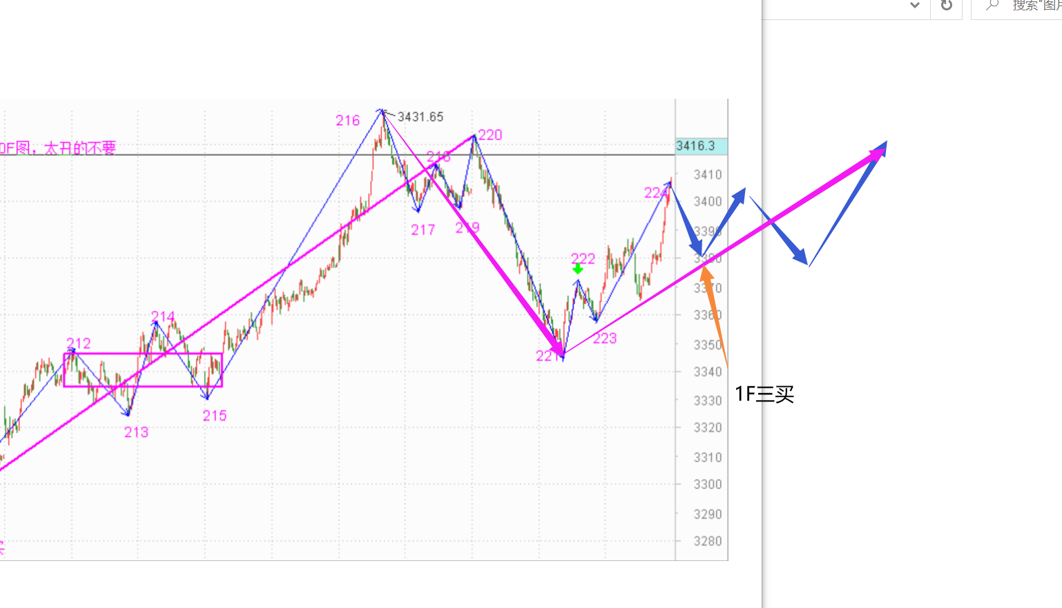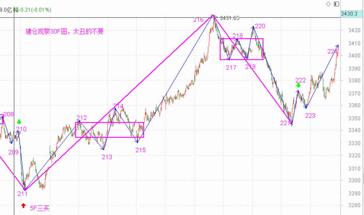 今天上证的上涨比较猛,已经接触到了前面的中枢,所以趋势下跌是不可能发生的了,同时下行走势也结束了,之前的趋势上涨被拆成两段盘整走势。现在开始的是一段上行走势,后面的发展有两种,一个是跌破3370,也就是222点,与222-223构成中枢,这个可能性相对来说比较小,毕竟涨了这么多。另一个就是在当前位置,或者涨更高的位置震荡出一个一分钟中枢,后面看它怎么发展吧。