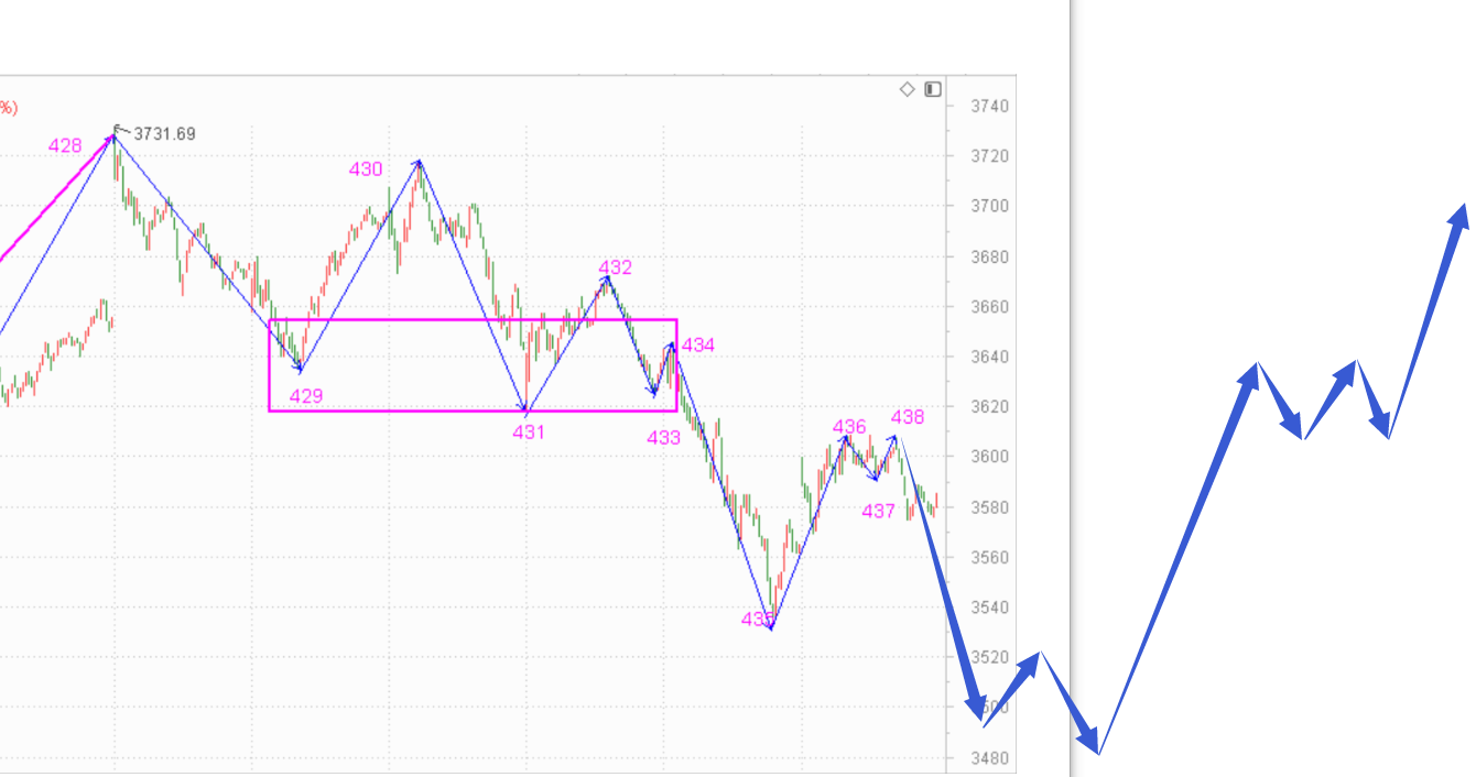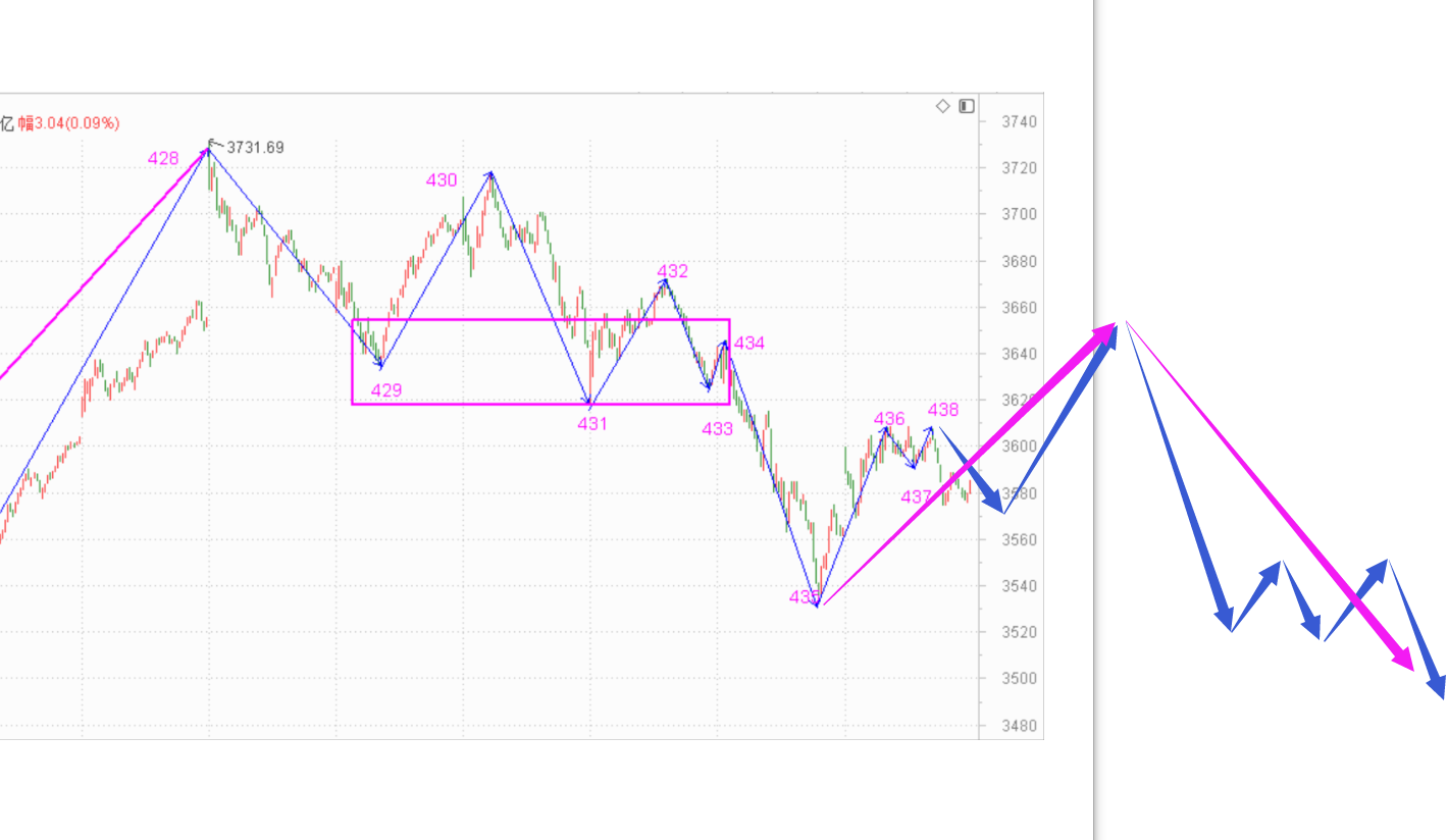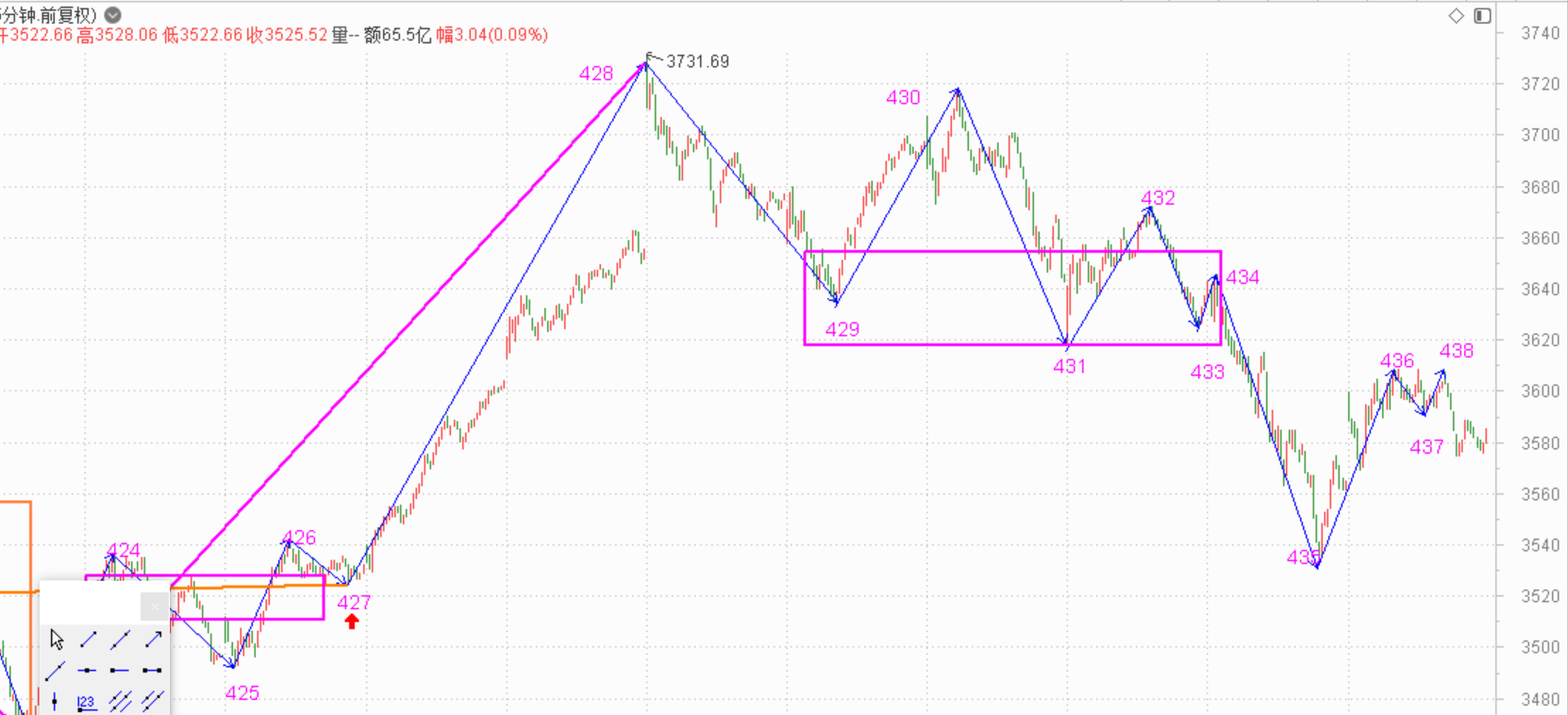 今天两地走势又分化了,上证涨,深证跌,不过由于436和438都没有打回上一个中枢的范围内,所以明天要是一笔跌下来的话,依然可以看作是下跌趋势,不过如果这么走的话,基本上不会发生趋势背驰,后面还会有更低,跌破3500基本上就确定了。不过按当前的走势看,更好的视角是将428到435看作一个盘整下跌走势,从435开始时一个一分钟上行走势,目前在构建中枢,明天看这里怎么发展了。