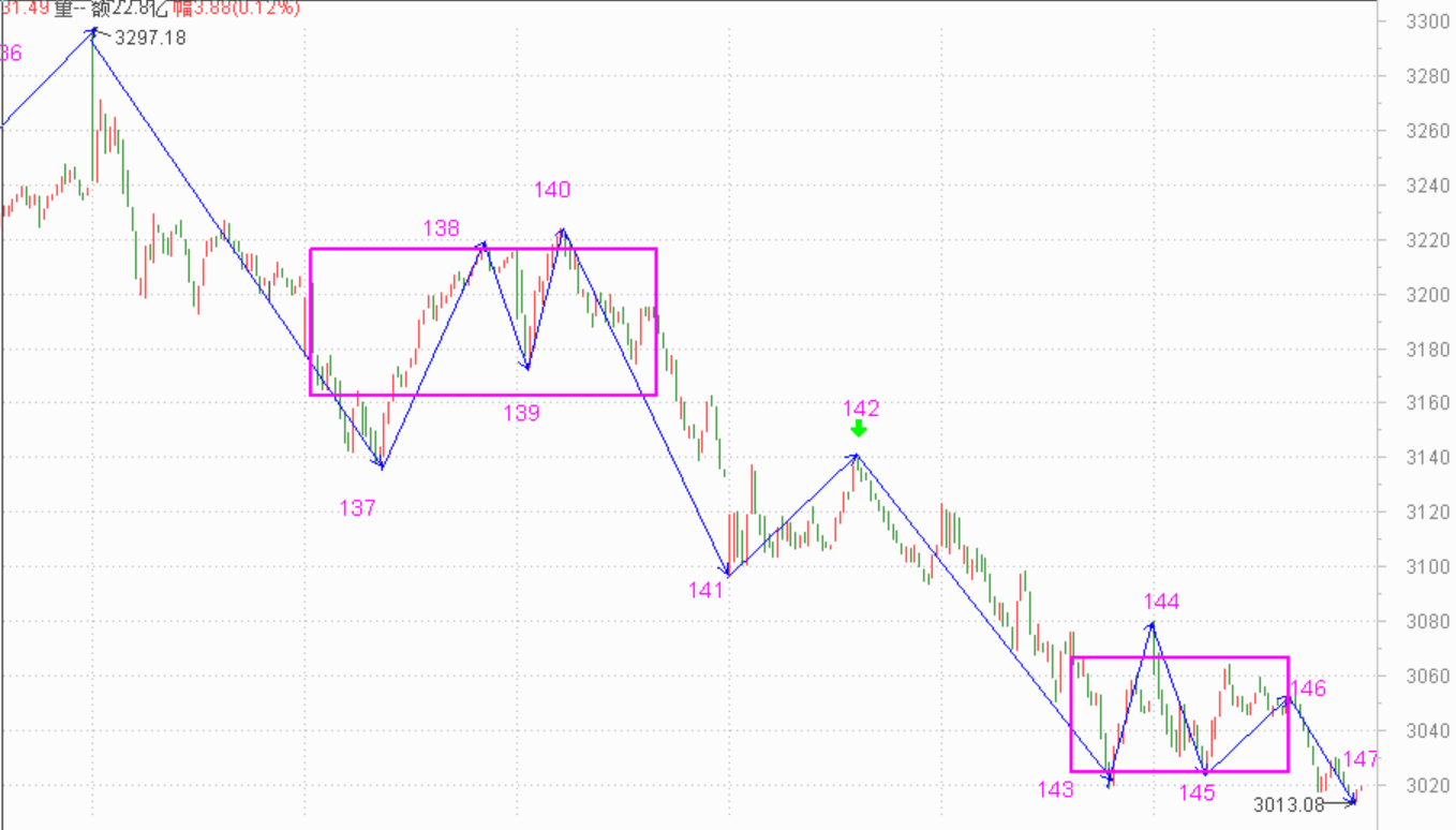 从创业板的走势看,这段时间的下跌是一个双中枢趋势下跌,近十个点的跌幅,趋势下跌就是这么狠!今天收盘前创了低点147,这里目前看是个趋势背驰点,后面是有一段一分钟上行走势的。当然,由于这里的级别是线段,所以明天开盘就下行的话,是可以打破趋势背驰状态的,那么后面就要等第三个中枢出现,或者三卖点背驰了。这也和上证的走势相呼应,如果明天开盘就跳水,那么上证发展成为趋势下跌,并且不背驰;同时创业板大概率变成三中枢趋势下跌。而如果明天开盘上行的话,趋势背驰状态成立,耐心等待一分钟的上行走势完成吧。