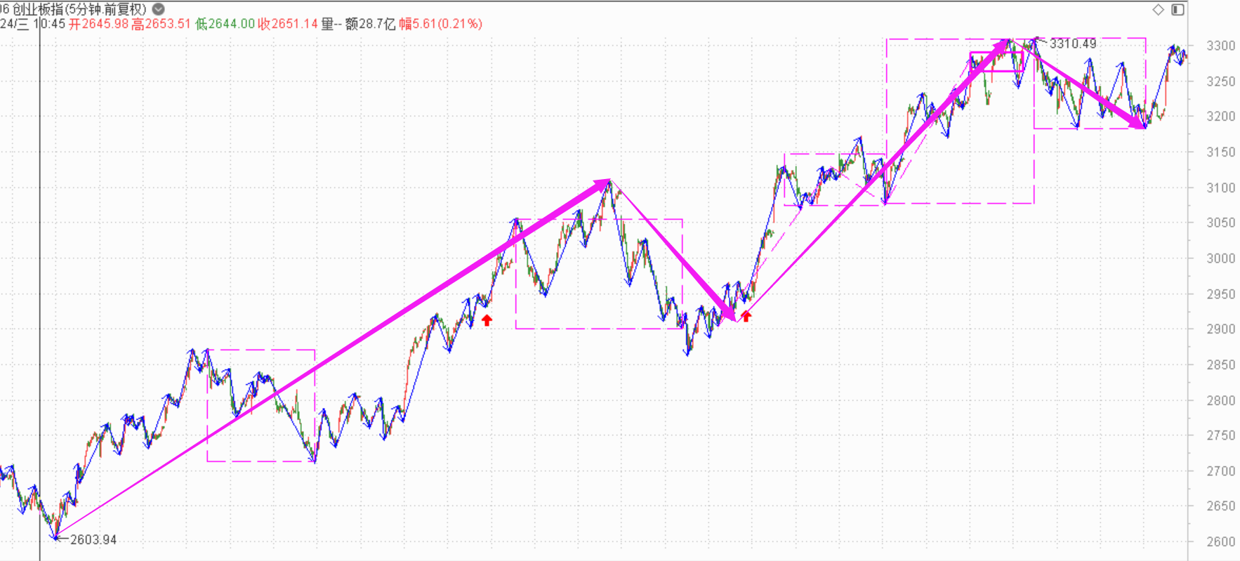 创业板指数我一直等着它跌破前面的高点3170,可是两周了还是没跌下去,昨天完成第三个扩展中枢后,今天又拉了起来。既然如此,这路上涨就要换个视角分析了,如上图所示,这一轮上涨看作是几个五分钟盘整走势的组合,昨天向下一笔回调,形成了三十分钟的三买,所以今天创业板涨的非常可观。