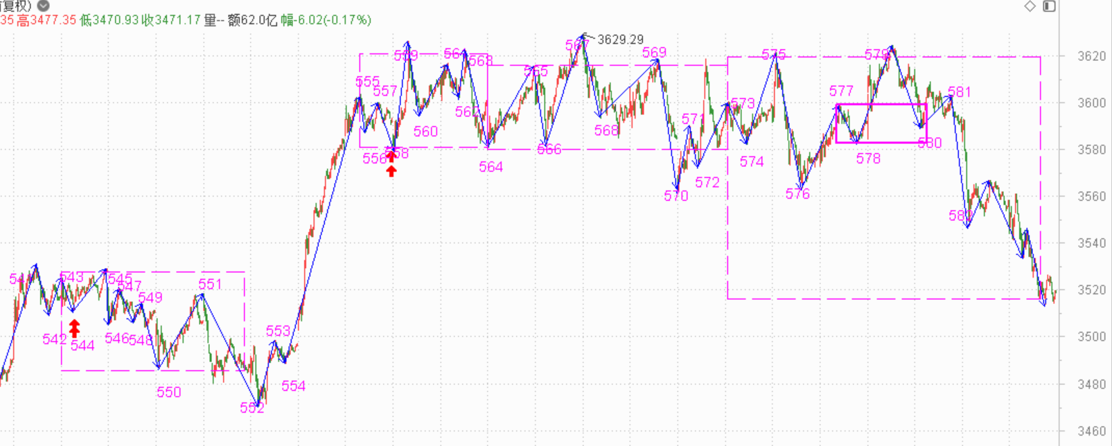 本以为今天指数会上拉一笔,从而形成三卖,然后在向下呢,结果直接低开低走,全天连个像样的反弹的都没有。真是不能太看重预期了,在走势面前,什么预期都给你打落的一塌糊涂。今天上证全天下跌,并且是最恶劣的线段下跌,从高点579下来,连个一分钟的中枢都没有。后面的任务就是等待一分钟中枢的出现,然后再执行对应的操作。明天的第一步就是看反弹的高度,能不能打回3533,回去了,还有的玩,回不去,还得跳水。