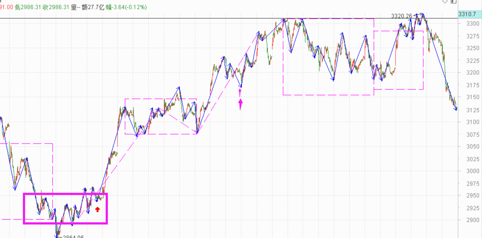 今天又把创业板指数拉出来了,不知道还记不记得之前说了好几天的五分钟双中枢趋势背驰,当时明确指出后面的走势必然要跌回前面中枢震荡的高点3175附近,这都过了两三个星期了,今天还是跌了回来。按禅师的趋势转折定理,目前的走势放弃了第一类,现在的选择是第二类或者第三类。第二类是当前位置扩展为三十分钟中枢,这就要求未来两天的反弹,必须打回3200(只限于创业板),如此的话,未来的走势还可以期待。