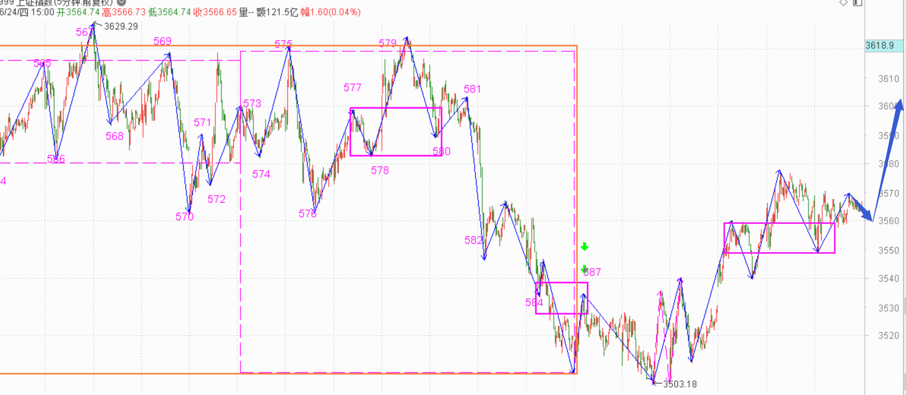 昨天预期今天上证来个大涨的,然后一举突破中枢上沿。但是预期毕竟不是实际,上证盘整一天,做出来了一个一分钟的中枢。在当前位置,上证有三种走势,一个是明天开盘小幅度回调,形成针对这个一分钟中枢的三买,然后向上突破,这是最好看的;再就是开盘高走,突破今天的高点,但是后续无力,发生盘整背驰,后面就是向下落体了,至于怎么落,看主力的仁慈了;第三就是,在这个位置墨迹一两天,磨蹭出一个五分钟中枢来,然后再选择方向,这是最烦人的走势。