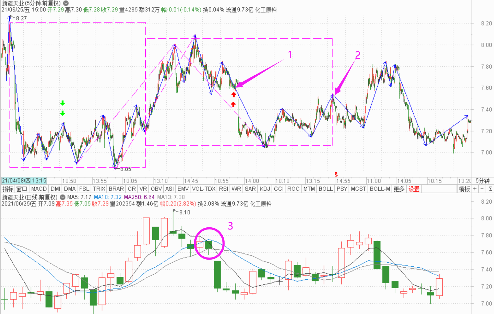 单看线段上,这里买入没有太大问题,但是结合到日线,问题就大了,因为当天绿线收盘,所以直接形成了一个五日线和十日线的死叉,那第二天的跳空下行也就很正常了。