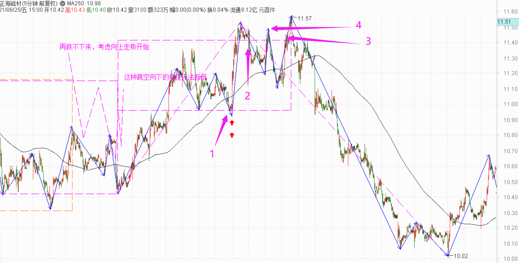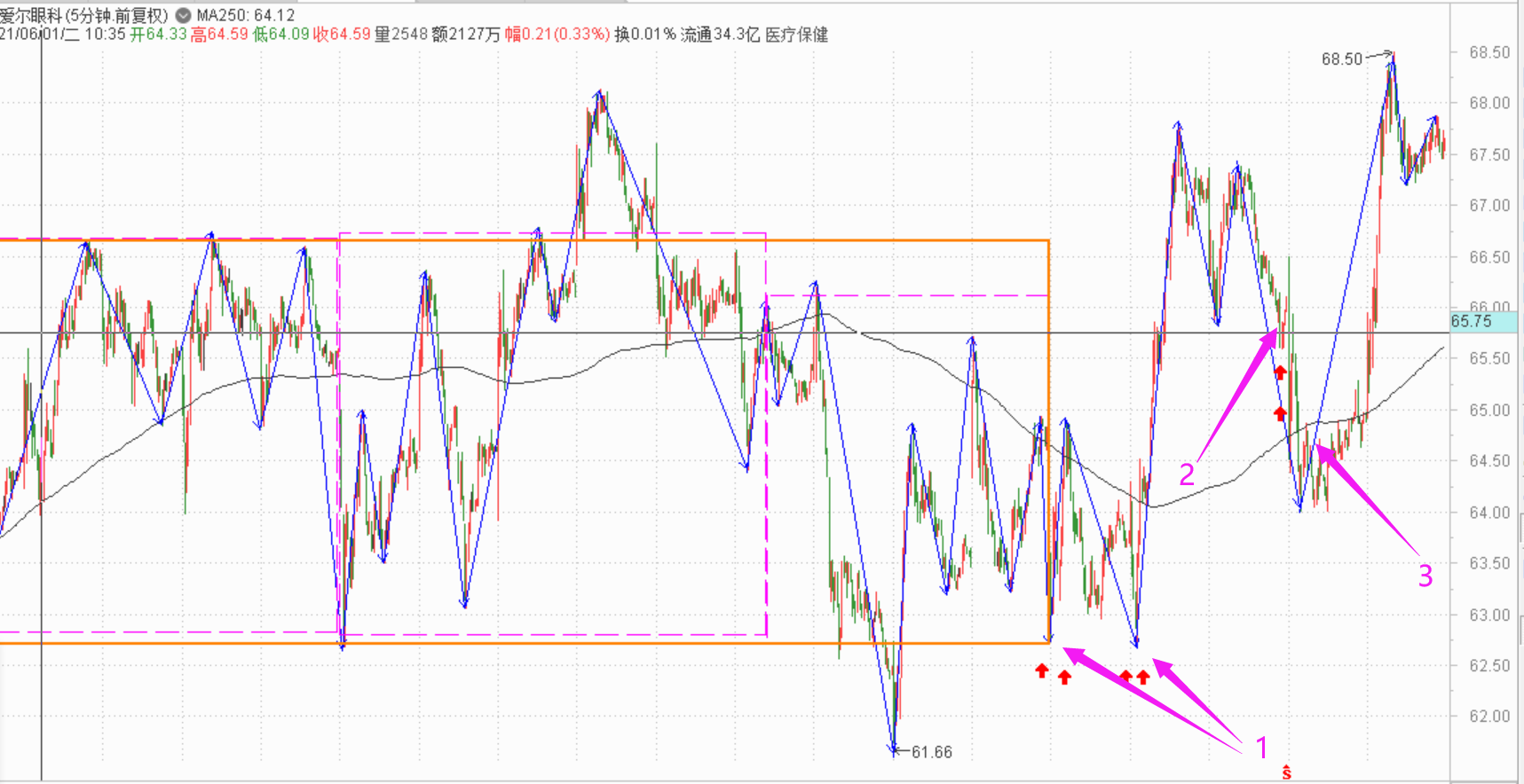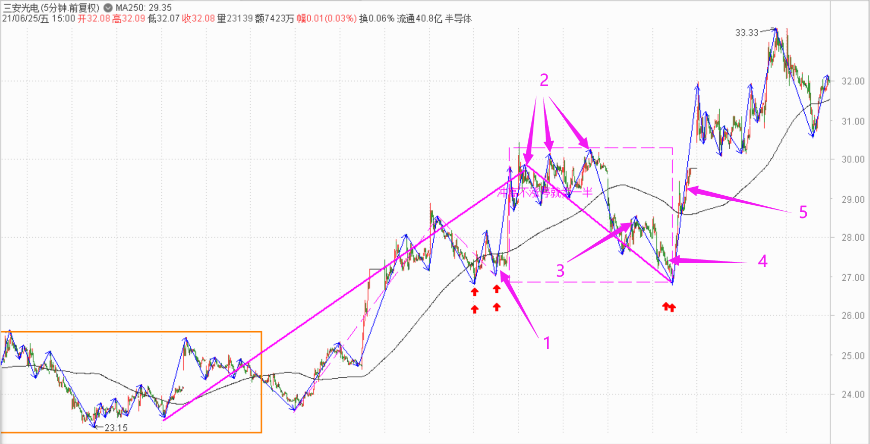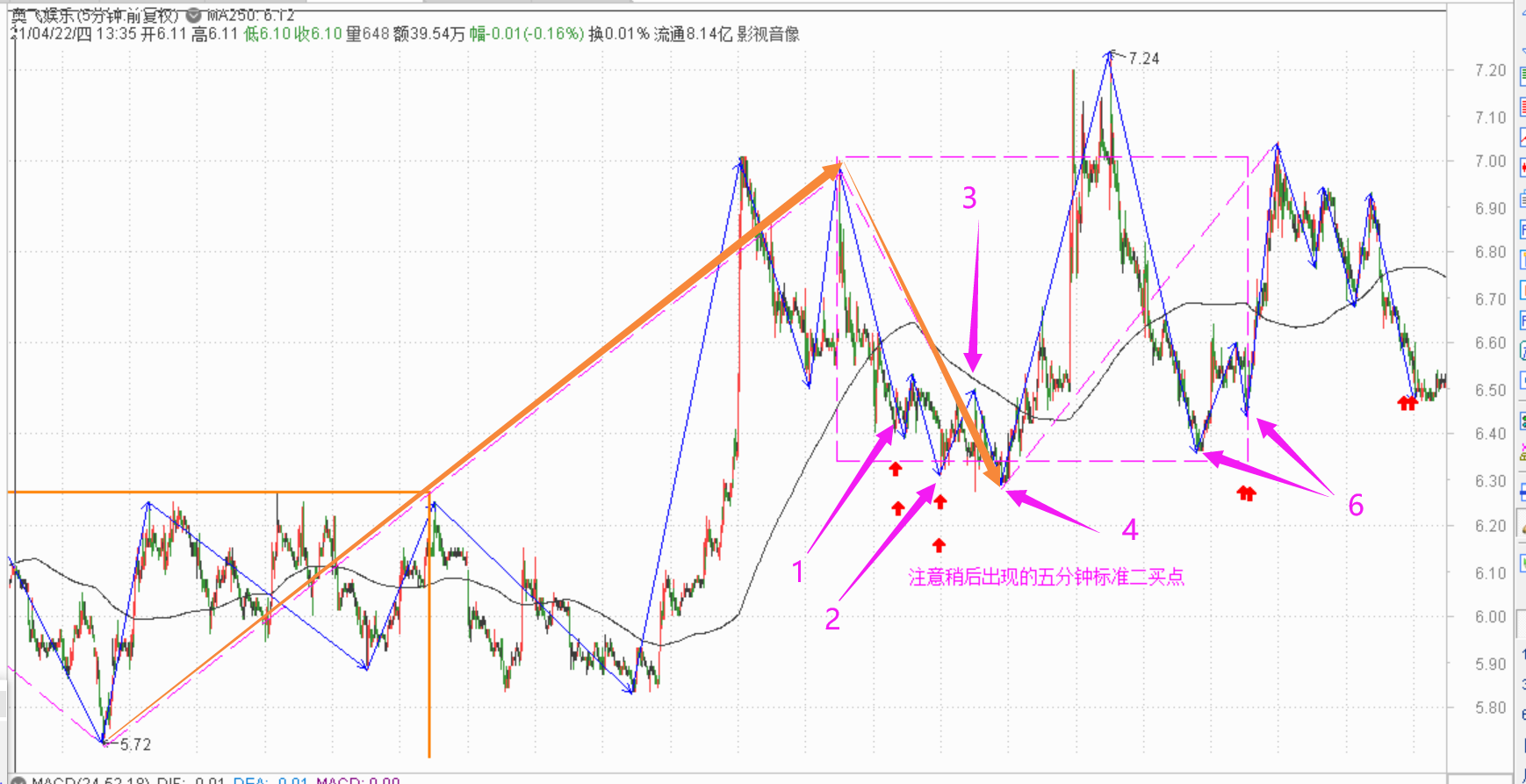4点:按橙色箭头,这里是一个五分钟标准二买点,两个一分钟的走势构建的。以后要多注意级别的联立,一分钟买点没抓住,还有五分钟扩展三买,再抓不住,还有五分钟标准二买,再不行,后面还有三十分钟的二买,不要急。