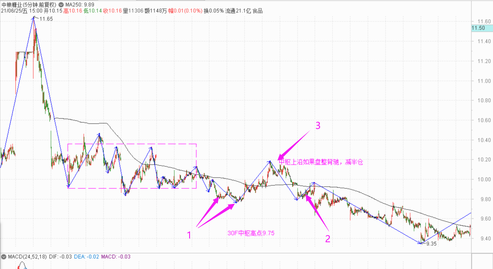 4点:其实这个点才是标准的卖点。因为在扩展三买出现后,向上的三段如果发生盘整背驰,证明发展成为趋势的可能性不大了,那么就在第三段背驰的时候退出。4点这里,连新高都没有,就更弱了。4点这里没能新高,后面开始跳水太正常了。其实这里3点我能全身而退纯属侥幸,这段上涨完全可以不存在的。