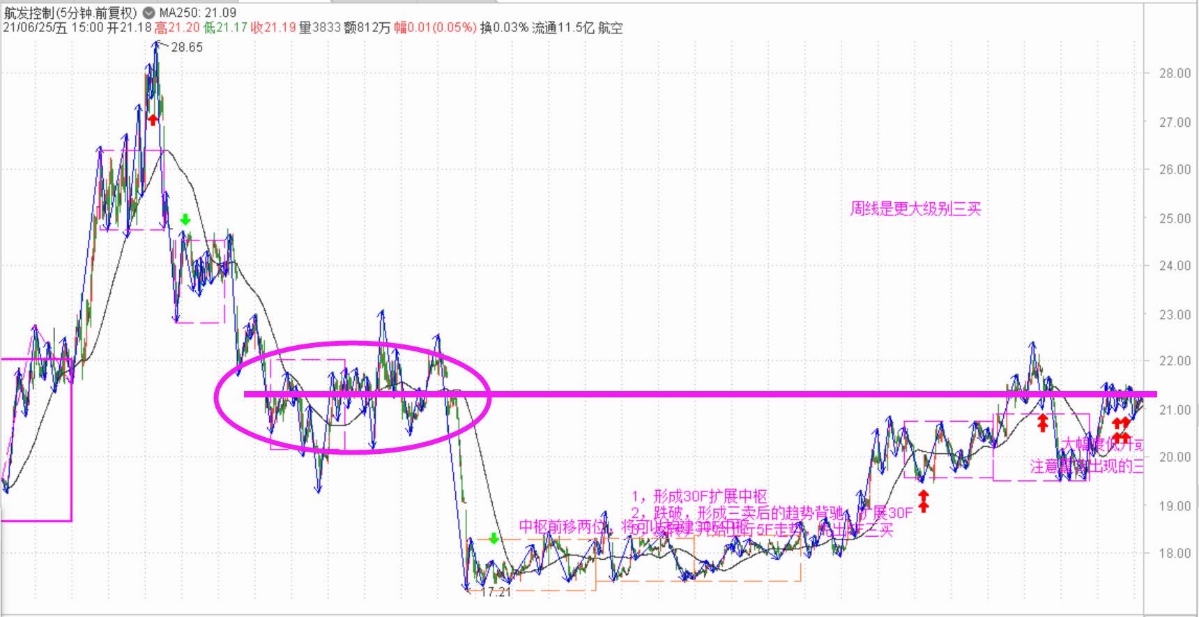 上图是更多时间的图,可以看到三买附近对应着前面的五分钟中枢,证明这里有比较大的套牢盘,所以除非强势向上突破,否则大概率还是向下的。