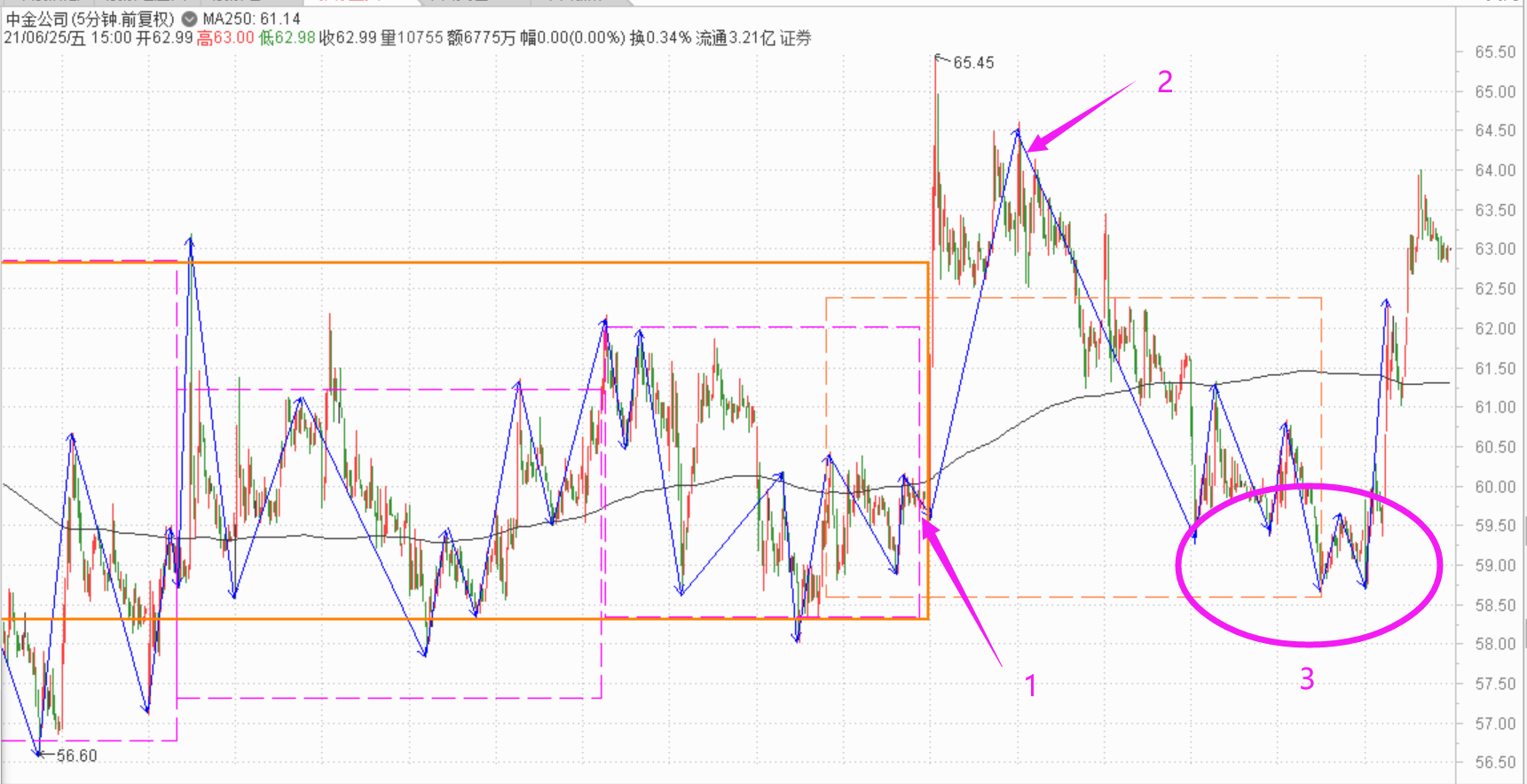 1点:建仓点。这笔资金是卖掉上面的三安切换过来的。当时三十分钟扩展中枢构建完成,这是最后一笔下,又赶在尾盘,于是直接进了。第二天低开高走,直接冲了八个点。受前一天三安的影响,以为又要冲击涨停的。但是,当天的证券板块只是上冲了个把点就熄火了,中金虽然是龙头,后面还是跌了回来。