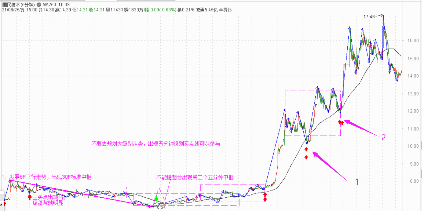 1点:相对于前面五分钟中枢的扩展三买点。位置看起来很高,所以没敢进。这种走势的,前面一个线段的低点也可以作三买,但是后面的拉升要注意,一旦不能大幅度突破,后面还会回落,很可能更低,国民就是这样。这个三买后直接拉了涨停,证明这种选择是更好的。