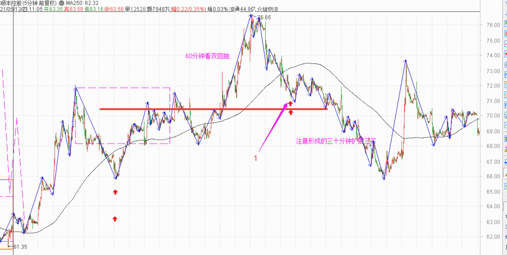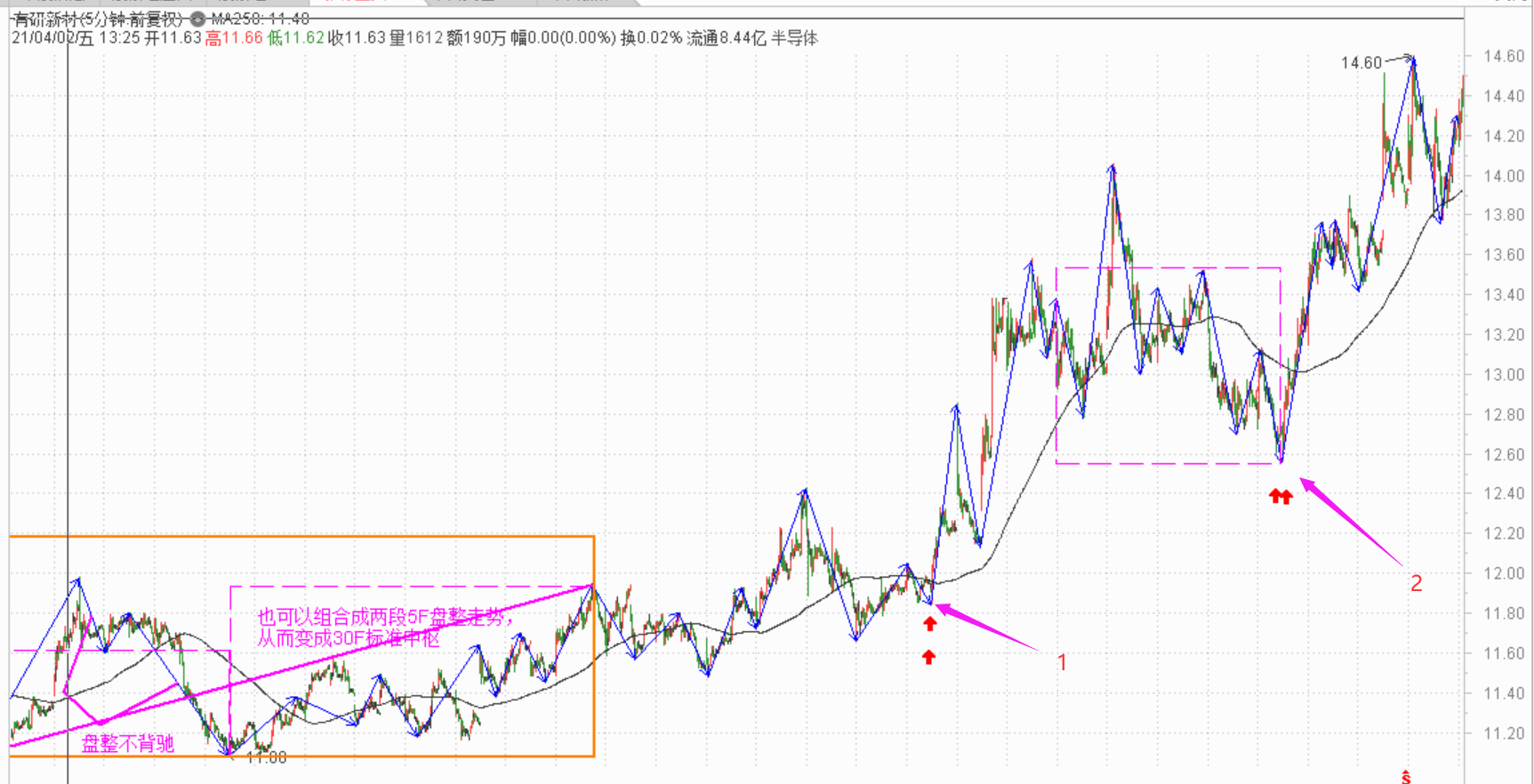 1点:三十分钟扩展中枢完成的买点,这里最后一个扩展中枢的组件有三段式有五段式,由于都是线段走势,没有一分钟中枢,所以是同级别的,可以作为五分钟扩展中枢的构建。