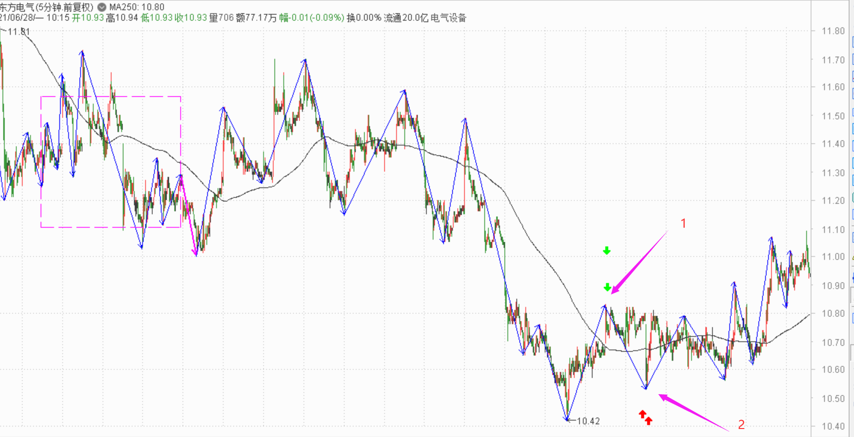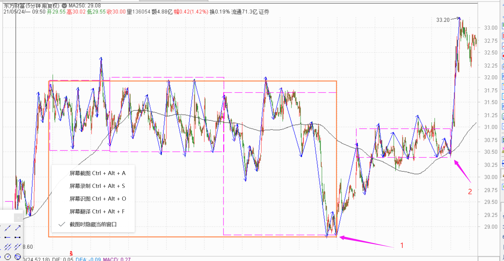 东方是我主动放弃的个股,当时这个和中金都属于证券的买点,中金的中枢非常标准,而东方在三十分钟完成时位置较低,觉得向上突破中枢会比较费劲,没想到它强势突破了。