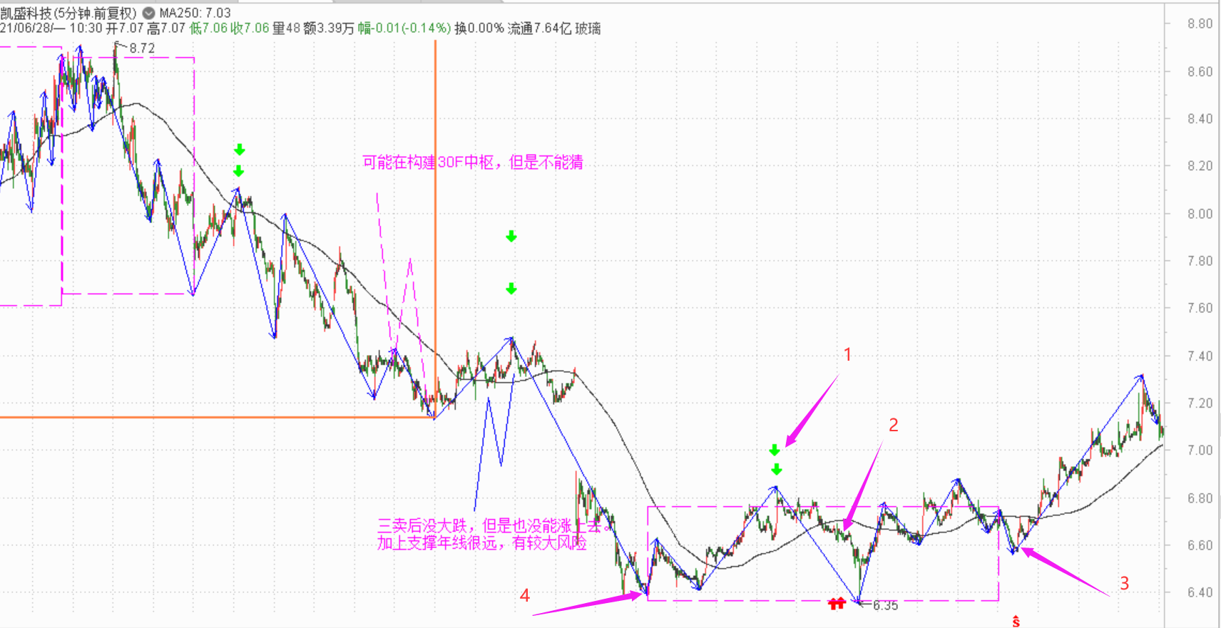 2点:箭头所指的位置为收盘位置,并不是后面的低点6.35,因为三卖后没有大幅度跳水,我就认为了买点成立,标记了上去。以后碰到这种买点关系的,没有新低背驰,可以采取分仓处理,先买一半,如果向下诱空就再补充一半,或者等待一分钟的二买进去。