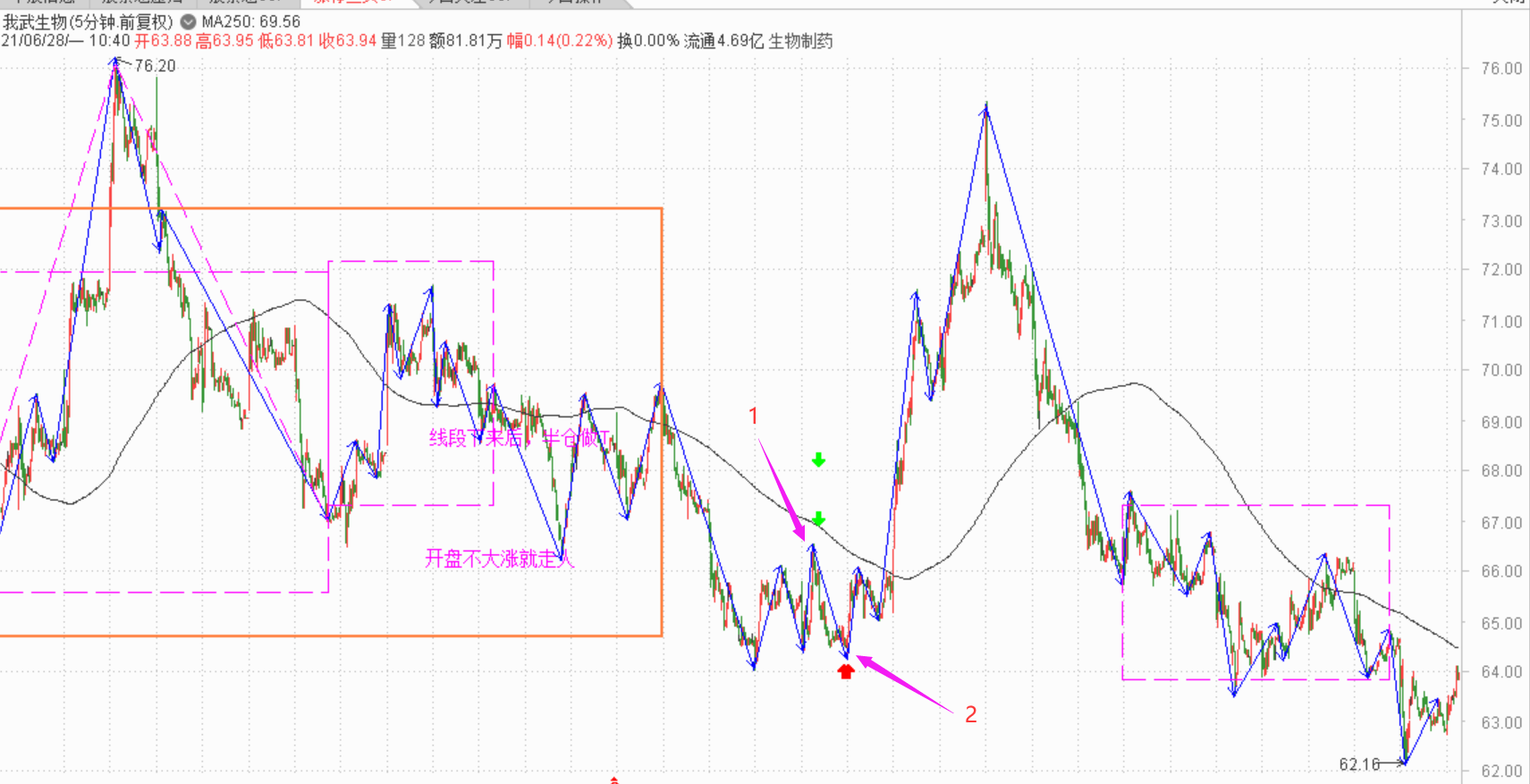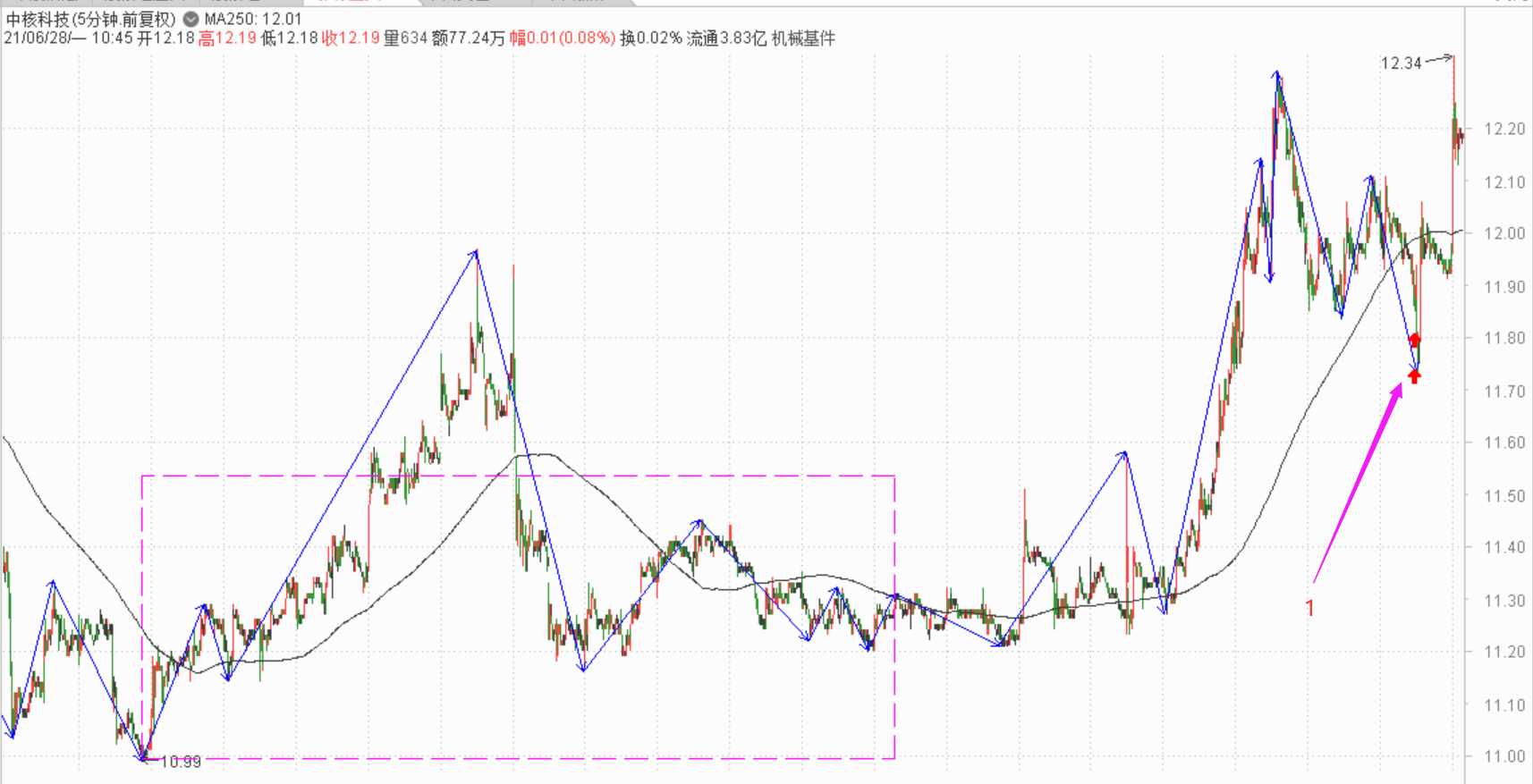 2点:根据背驰关系划分的五分钟扩展中枢完成的位置,因为中枢前面的进入段有个涨停,所以线段从第二个低点开始画起。这点相当于前面三十分钟扩展中枢同级别分解后的标准五分钟三买点,一分钟趋势上+一分钟盘整。当时由于仓位的原因,放弃了。