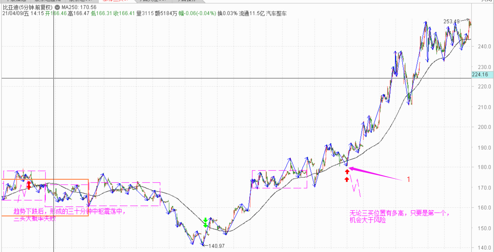 上周总结了比亚迪的买点,是五分钟扩展完成后的标准五分钟二买点,今天的是扩展三买。