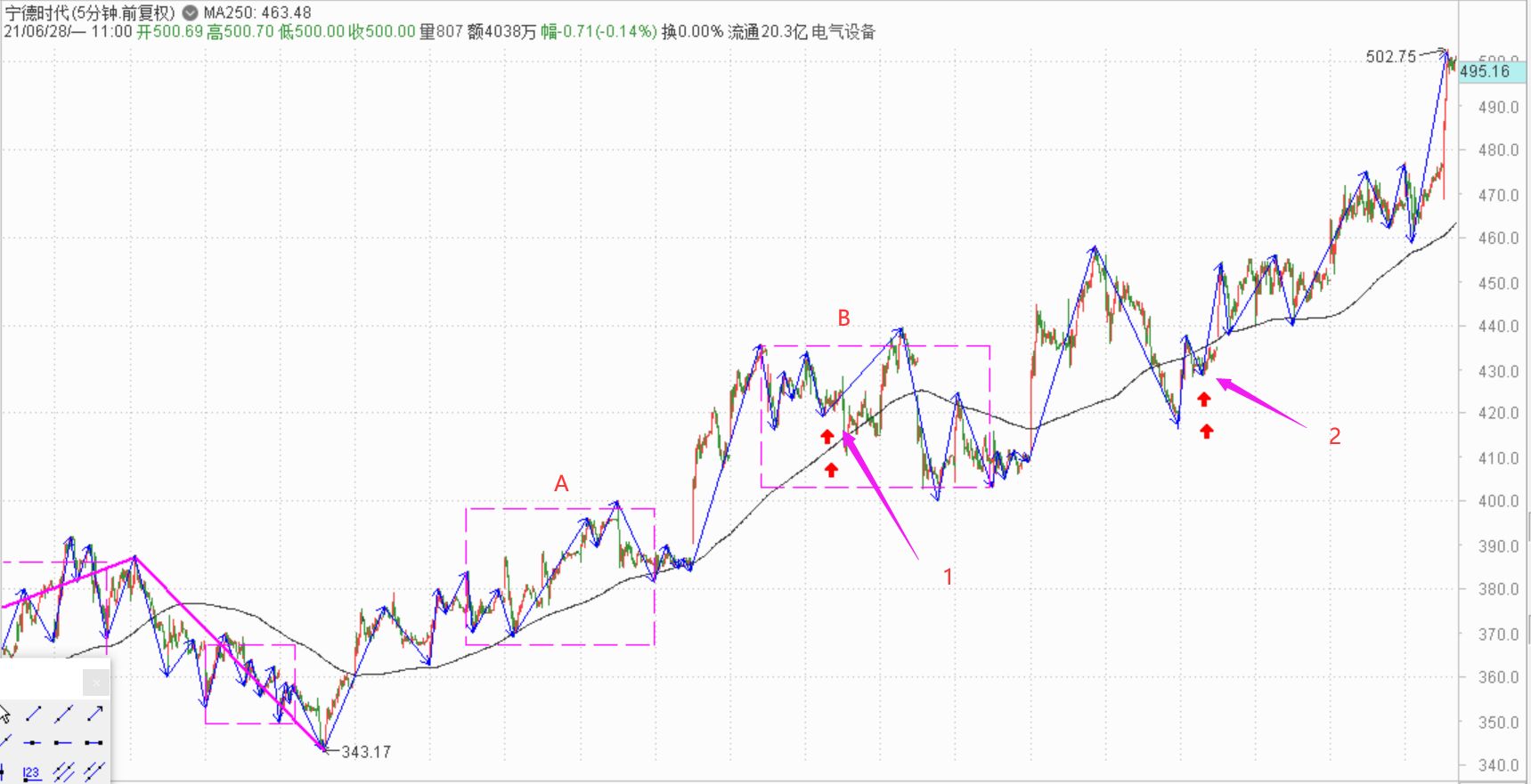 其实在中枢A里还有一的个针对前面中枢的三买点,当时价格380,我觉得贵;后面涨到400,那就更贵了;结果现在涨到了五百。现在宁德已经形成五分钟趋势上涨,并且不背驰,第三个五分钟中枢还没出现,用NBA的一句话说,“天空才是他的极限”。