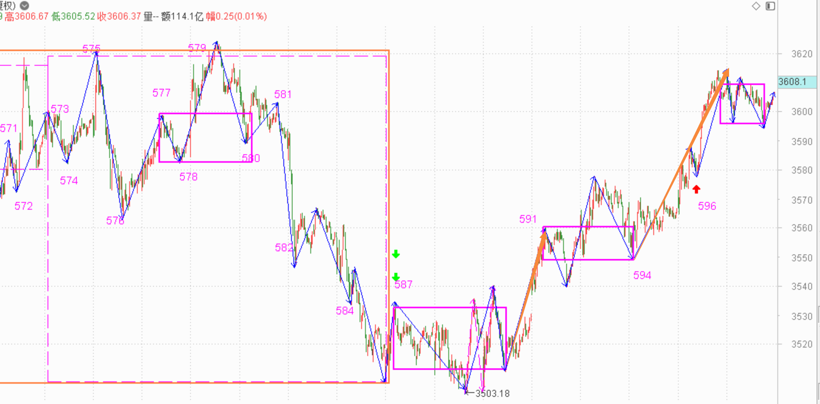 今天上证横盘震荡了一天,又形成了一个一分钟中枢,加上前面的两个,已经形成了三中枢趋势上涨。看橙色两个箭头,明显没有背驰。由于这段走势属于三十分钟中枢的离开段,从当前的力度看,大概率是一个五分钟的走势了,所以在五分钟中枢出现前,这段上涨就不会停。