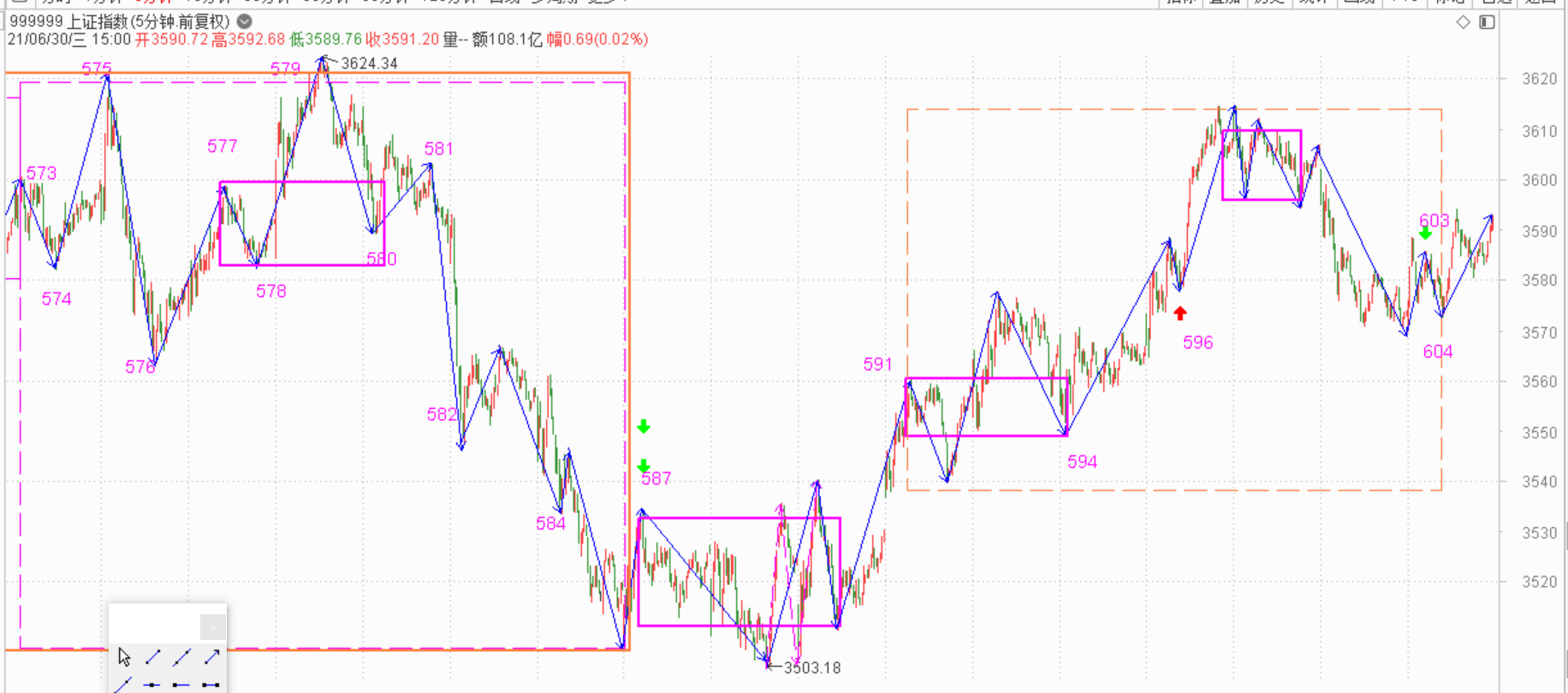 这两天上证没能继续上涨,所以就震荡出来了一个五分钟扩展中枢,只是这个中枢有点儿特别,有三段式线段和五段式线段构成,但是两种都作为标准一分钟以下级别的走势,也能满足构建五分钟扩展中枢的条件,就是出来的中枢不那么好看了。上图中,从591到604就是这个五分钟的扩展中枢,既然中枢出现了,那么意味着买点也就出现了,所以604这个点就是标准五分钟二买点。