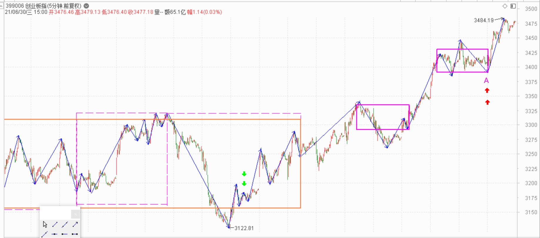 如果明天回调,针对A所在的中枢形成三买点,但是后面不是强势突破,那么这里将发生一分钟趋势背驰,至少五分钟的中枢就要出现了。由于创业板已经突破了年内高点,下一个高点就是历史高点了,这个位置震荡一下也说得过去。我觉得最好的是,这个位置突破后进行五分钟的震荡,然后下个位置进行三十分钟的震荡,这就相当完美了。当然,这只是我的一厢情愿而已,具体看走势了。