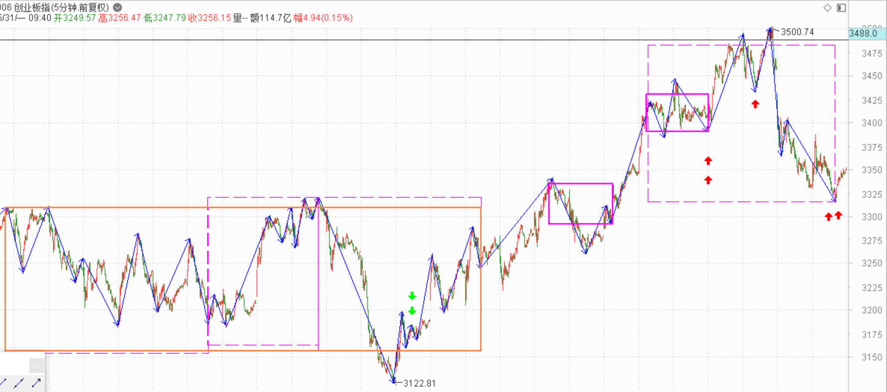 周五说创业板形成了一个标准五分钟的二买点,同时也是下发五分钟标准中枢的三买点,所以今天开盘就向上阳刚起来,但是没想到下午就萎了。由于下午的回落,这个三买点已经被破坏,显然这种属于弱势了,所以明天创业板大涨的希望不大了。由于当前处于买点位置,不能大涨的话,大概率发展成为更高级别的中枢中枢震荡,而由于之前三十分钟中枢的存在,如果这里向日线级别震荡发展的话,后面的回落有可能比较深了,所以要做好防守了,如果后面三段上涨不能新高,背驰的时候注意减仓。