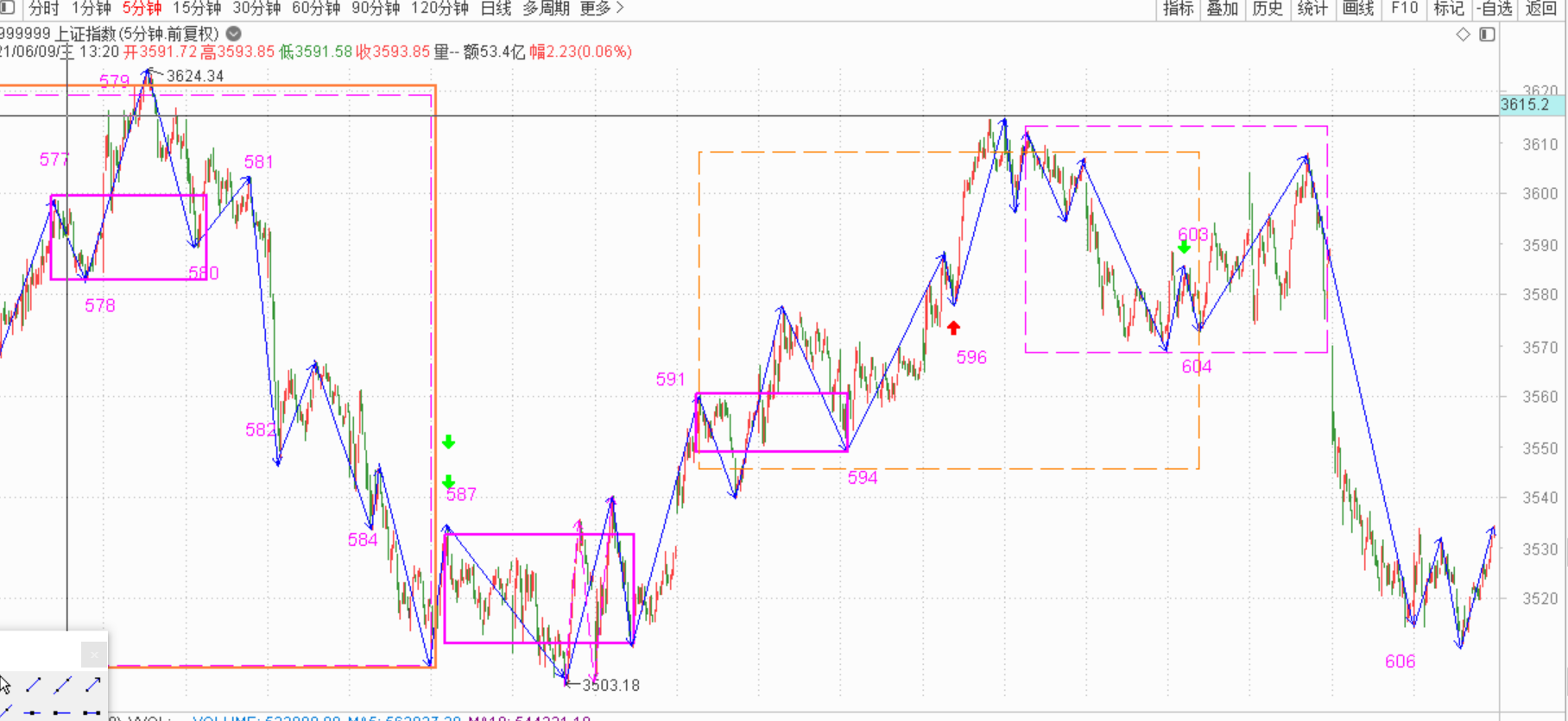 结构上看,目前上证处于三十分钟扩展中枢的下沿,线段盘整背驰,理应向中枢上沿运动。但是凡事无绝对,今天收盘的位置是一个五分钟三卖点,当然,前提是明天开盘不上涨。所以未来的规划就比较清晰了,如果明天开盘继续上涨,要将这个三卖点预期破坏掉,那就意味着明天将是一个中阳线, 因为至少要涨到3570附近才行;反之,如果明天低开或者平开下行,那么就确认这个三卖成立。上一次三卖成立后,由于没能向下跳水,所以出现一波反弹到了中枢上沿3600附近,如果明天三卖成立,依然不跳水,那还将会上到3600附近了。这样看,明天是风险也是机会,至于是哪种,不去猜,但是指数不会让我们为难,应该开盘就知道了。