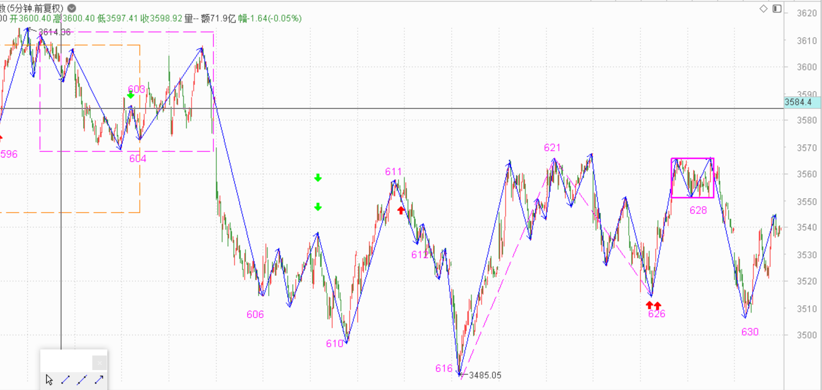 今天上涨低开下探,发现跌不下去就又涨了起来。震荡市场就这样,涨不动了就跌,跌不动了就拉起。从结构上看,626开始的一段一分钟的走势,现在有些变形,明天就看630开始的这笔能不能拉到628点了,如果可以的话,明天可能依然是震荡。如果拉不上去,这就会产生一个一分钟的三卖点,就看后面怎么跌了,如果跳水,依然是减仓;如果慢跌,那就补仓,因为后面大概率还是拉起来。