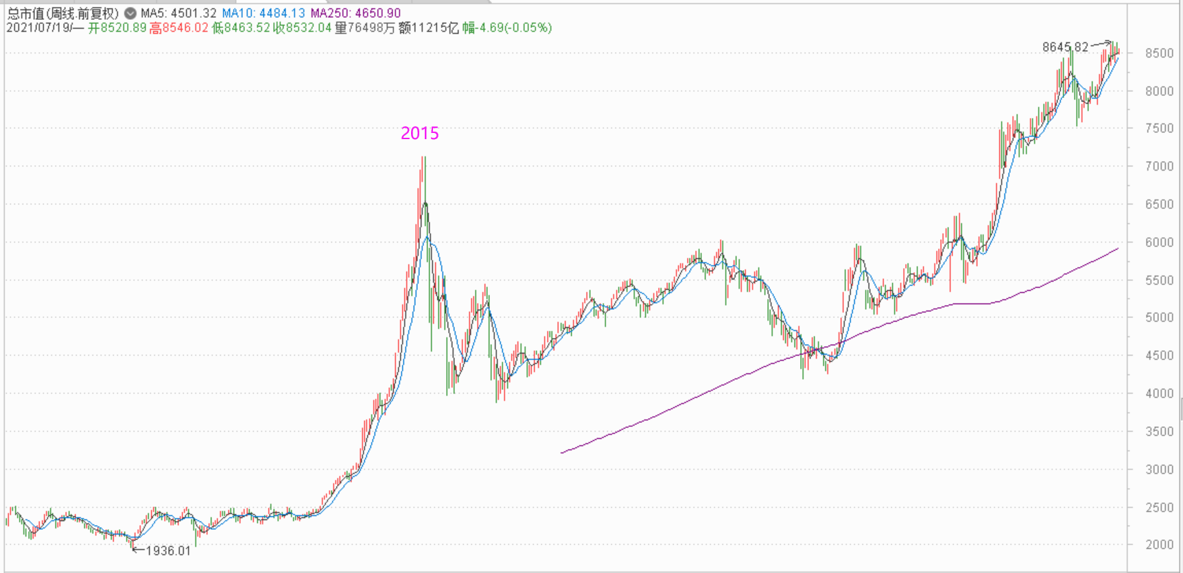 上图的点位7000应该是表示的是70万亿人民币,因为今天的点位8500附近,我拿上证和深证加了一下,刚好是85万亿。2015年我们总的GDP才68万亿(14年64万亿),但是两市市值已经超过这个数,按禅师的说法,已经进入了泡沫阶段,所以后面直接崩盘了。2020年我们的GDP是101万亿,这样看目前指数距离泡沫还远着呢。