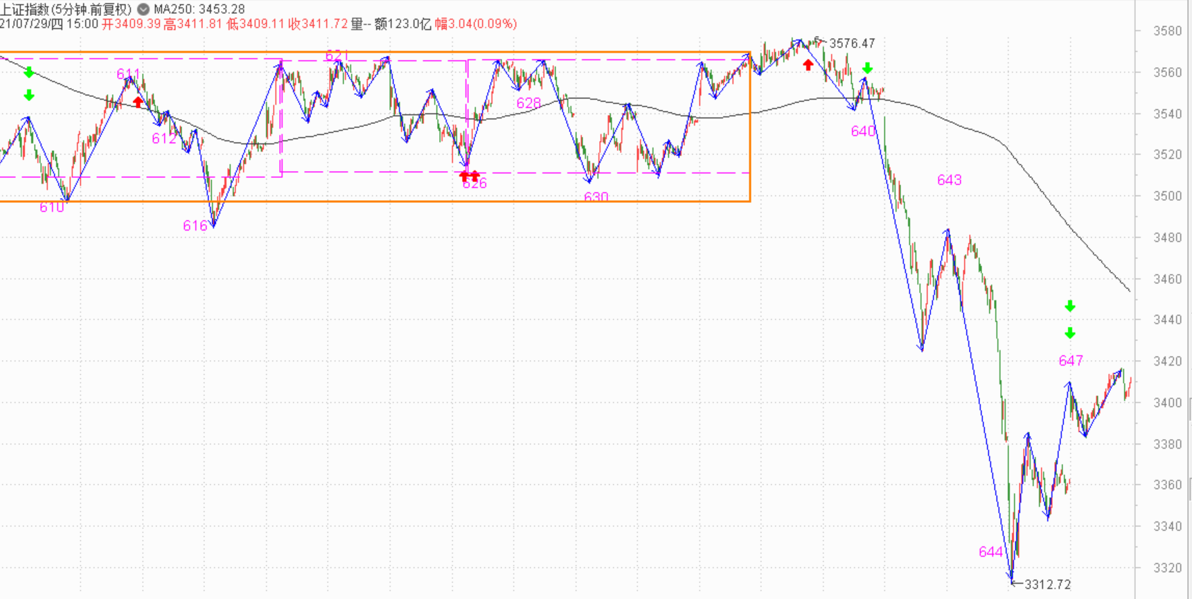 前天发文说小心上证的三卖,现在看明显是经验不足了,周一周二两天大幅度下跌,在线段上已经没有背驰状态,这样的话要形成双回抽的三卖就得等线段先背驰再说,所以在644这点出现之前,指数都不会反弹的,所以昨天在这个低点反弹的下探没能新低后,就知道后面即使出现三卖也没什么意义了,所以昨天发文也改了判断,即出现三卖也没必要减仓,操作上昨天尾盘还加仓了个股,今天果然有了收货。