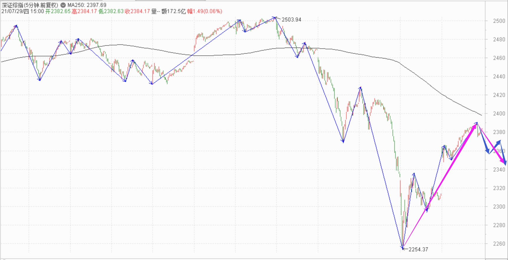看看深证综指的5F图,这两天的反弹形成了线段上的五段上涨,类趋势,并且收盘前疑似背驰,如果这个背驰成立的话,后面一般有三段回调。当然,由于这是线段级别的,比较不稳定,如果明天继续大幅度上涨,这个背驰也就没有了。不过如果形成了三段回调,这会是一个一分钟的二买点,后面理应继续上涨,但是后面反而不继续大涨的话,这里就比较危险了,因为后面的一段反弹会形成五分钟扩展中枢,由于这个位置处于三十分钟扩展中枢的下部,形成中枢的话在K线上形态就像是下跌中继了,后面极有可能继续向下发展。