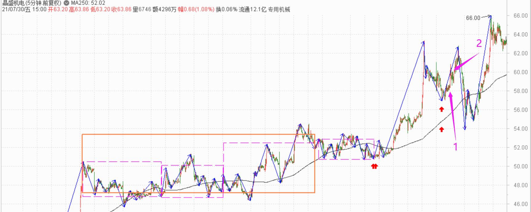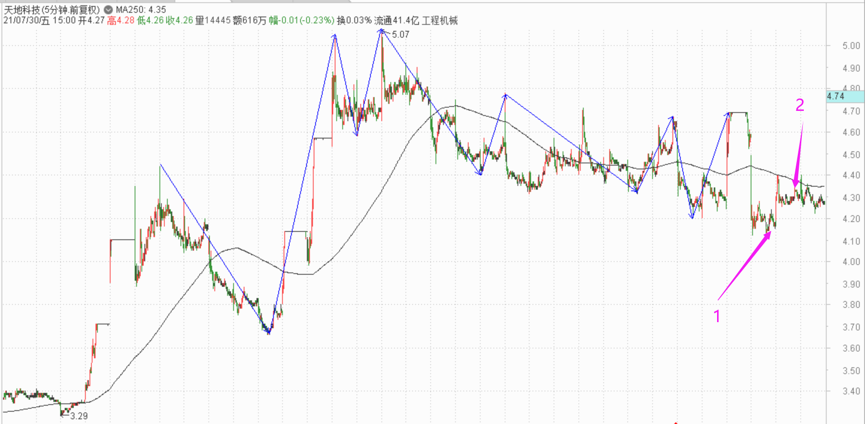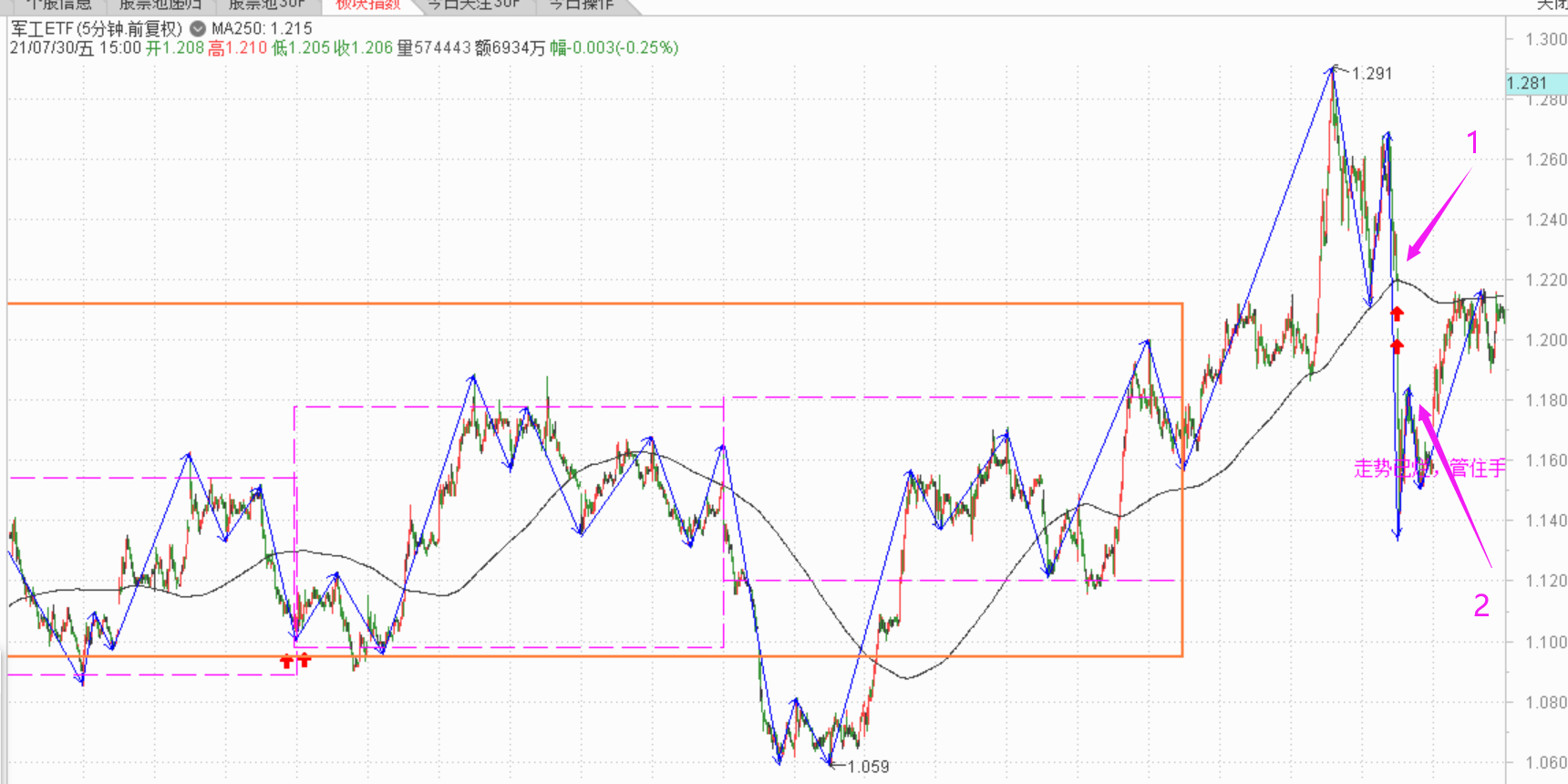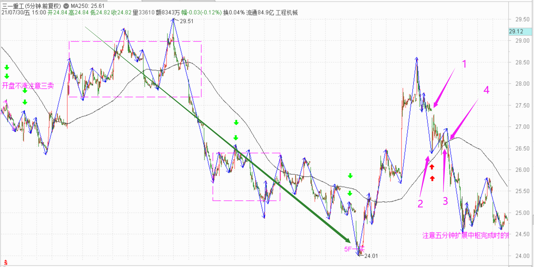 一般五分钟扩展中枢完成后的买点,后面只能涨不能跌,一段上拉不能突破前高要注意了,三段上拉还不能突破,一旦是盘整背驰状态,清仓是唯一选择。