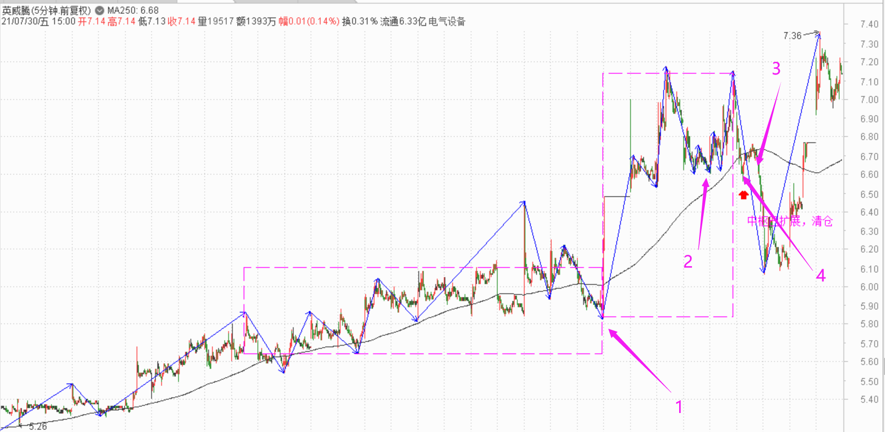 3点和4点的意义是一样的,周一指数跳水,但是英威腾并没有,周二指数横盘英威腾下跌形成了这个疑似买点。这里犯的错误就是没有等到尾盘,如果当天等到尾盘,英威腾的跳水已经跌破了前面五分钟扩展中枢的震荡区间,这里已经演化成了三十分钟的中枢,这个买点已经不存在了。
