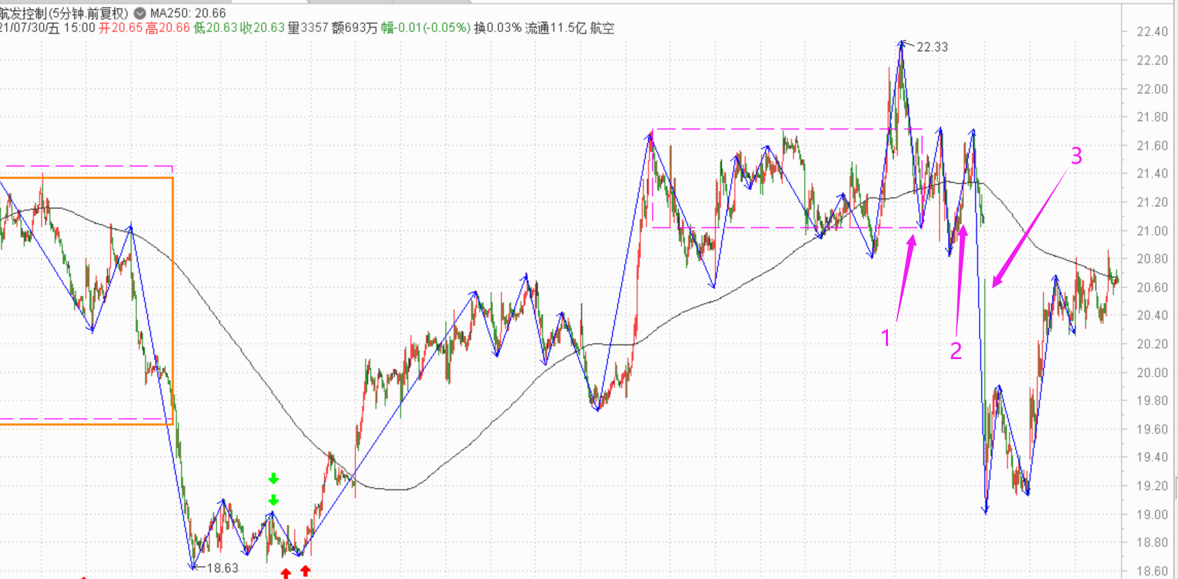 2点:清仓点。第二天开盘就急速上拉。但是吧,要知道这天是周一,当天三大股指全面跳水,就你一个上拉,没有板块效应,也改变不了什么,说深天马时运不济就是因为这个。如果不是指数跳水,深天马可能就直接开启一波五分钟的上行趋势了,前面三十分钟级别的盘整盘了三四个月,更大级别的周线的盘整更是盘了两年,但是这个主力应该没学过缠论,选择这个时间段上拉,最终硬是被砸了下来。