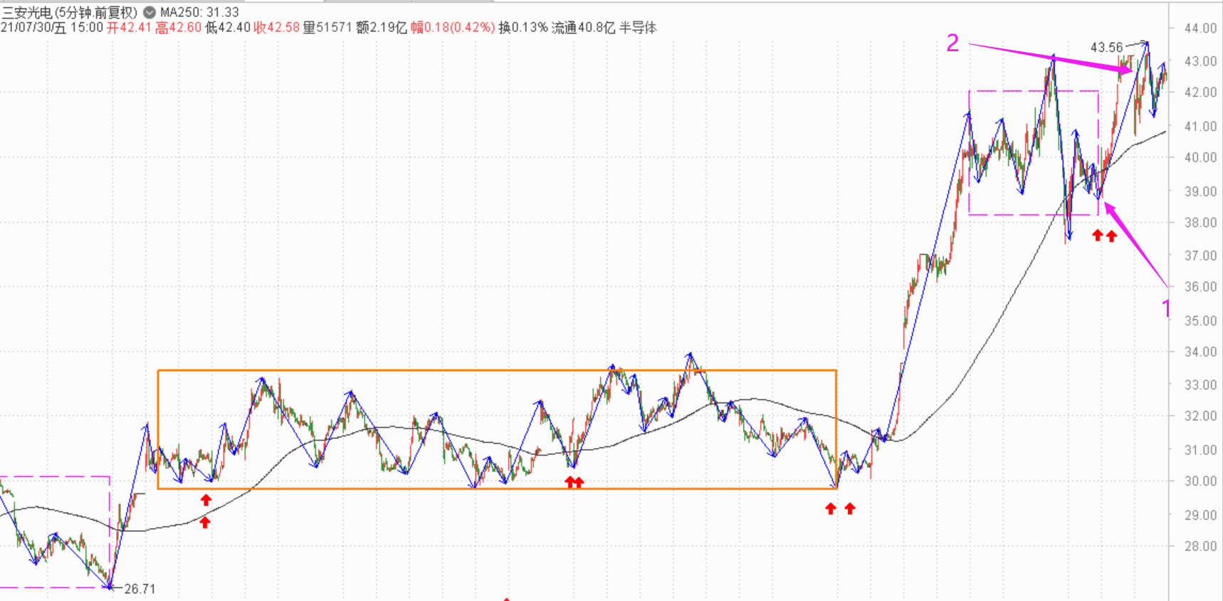 2点:清仓点。大幅度低开,小幅反弹就出掉了。说三安的遗憾就是因为这个,因为最近的指数形势,虽然它当天涨停了,但是第二天低开是大概率的,如果是头天买入的话,第二天涨停就直接卖掉了。不过这里考虑的也有些不足,一是因为当天半导体并没有跳水,反而有较大幅度上涨,所以三安后面也是拉红的。并且三安这里只是离开五分钟扩展中枢的第一段上涨,后面一般还有两段,从而形成三段盘整背驰再下跌,所以这里的卖出是可以再等等的。