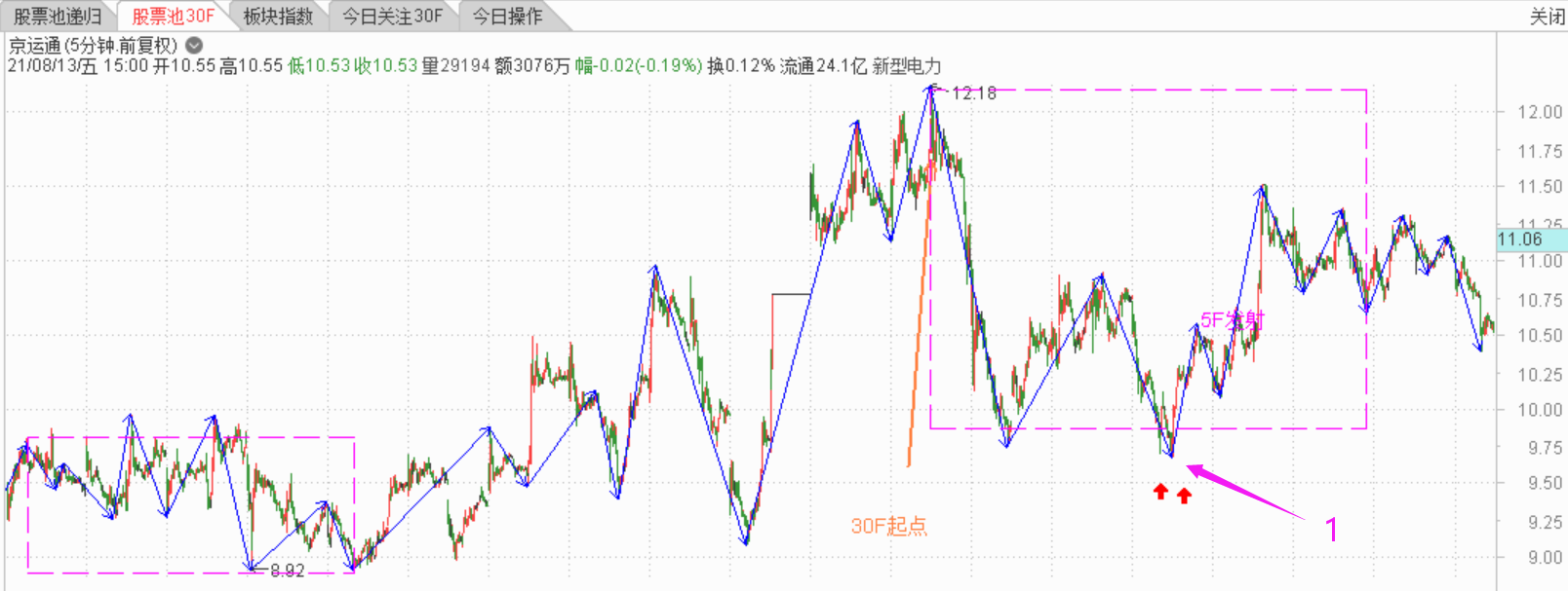 京运通这个属于中枢震荡的买点。前面标记的可能30F扩展中枢起点,是以最高价+背驰划分的。当天这个盘整背驰看到了,但是因为原则上我是不参与这种买卖点的,所以就没动,只是看看。然后第二天大涨,第三天盘整形成5F发射模式,第四天直接涨停。以后碰到这种超级明显的盘整背驰,如果再结合板块走势,就不要放过了,安全系数和性价比极高。