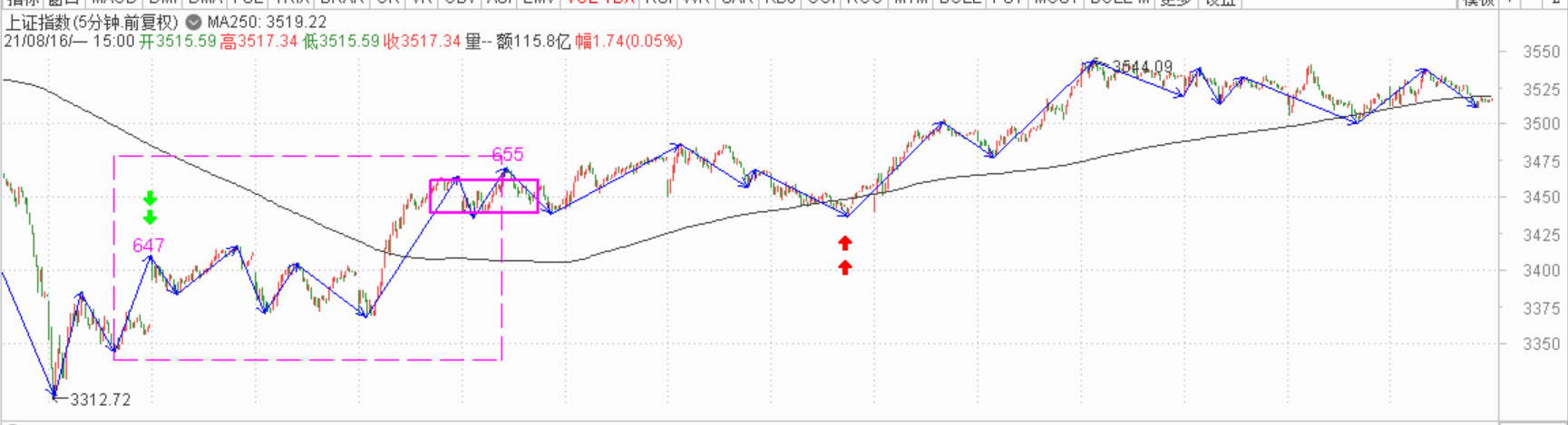 上证这样不上不下的,第二个五分钟扩展中枢马上就出来了。以3544起点算,还差一上一下两笔。快的话,明天上午就可以完成,然后下午就可以走向上的离开段。慢的话,明天完成两笔,然后后天开始走向上的离开段。由于这是第二个中枢的离开段,力度不足的话很容易背驰,然后向上走势就结束了,
