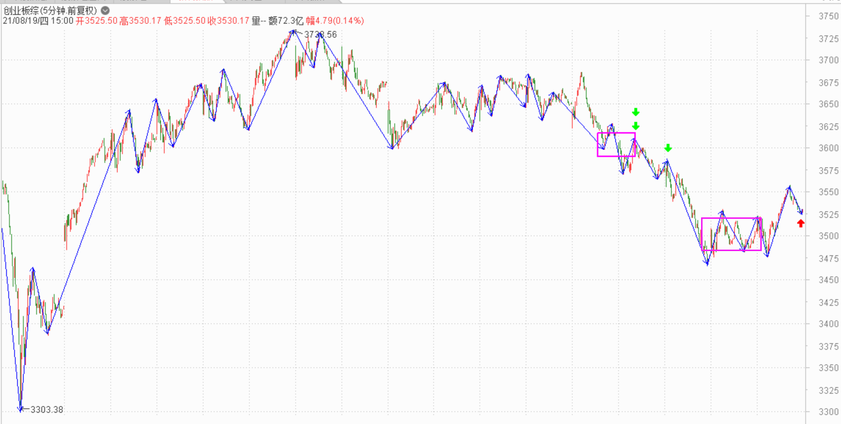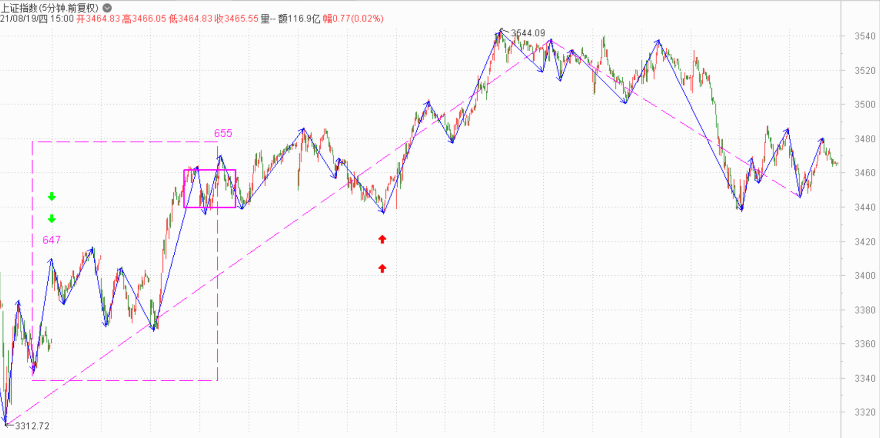 这两天上证的5F图的MACD都是在0轴下晃悠,今天尾盘算是拉了上来。图中虚线是目前划分的走势,从3312起来的上涨,如果严格的以5F扩展来看的话,只有3544开始的这段有一个,但是这种走势划分不好看,按虚线的划分,是一个一分钟的趋势上涨加一个一分钟的趋势回调,这样今天盘中的低点就是一个五分钟二买。同时收盘位置也出现了一个下行线段,同时MACD收在零轴上,这样看的话这里也是一个一分钟的二买,并且处于发生模式的雏形。一般这种形态出现,意味着后面要大涨的,明天看了。