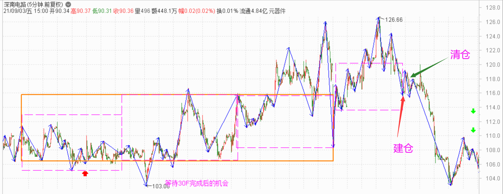 30F扩展中枢完成后,向上的离开段第一个5F扩展中枢完成时的买点。尾盘进入,第二天开盘后一度拉升,但是两三个点后开始回落,成本线上出掉了。这个也是中间高点的扩展中枢,以后这种一定要谨慎。