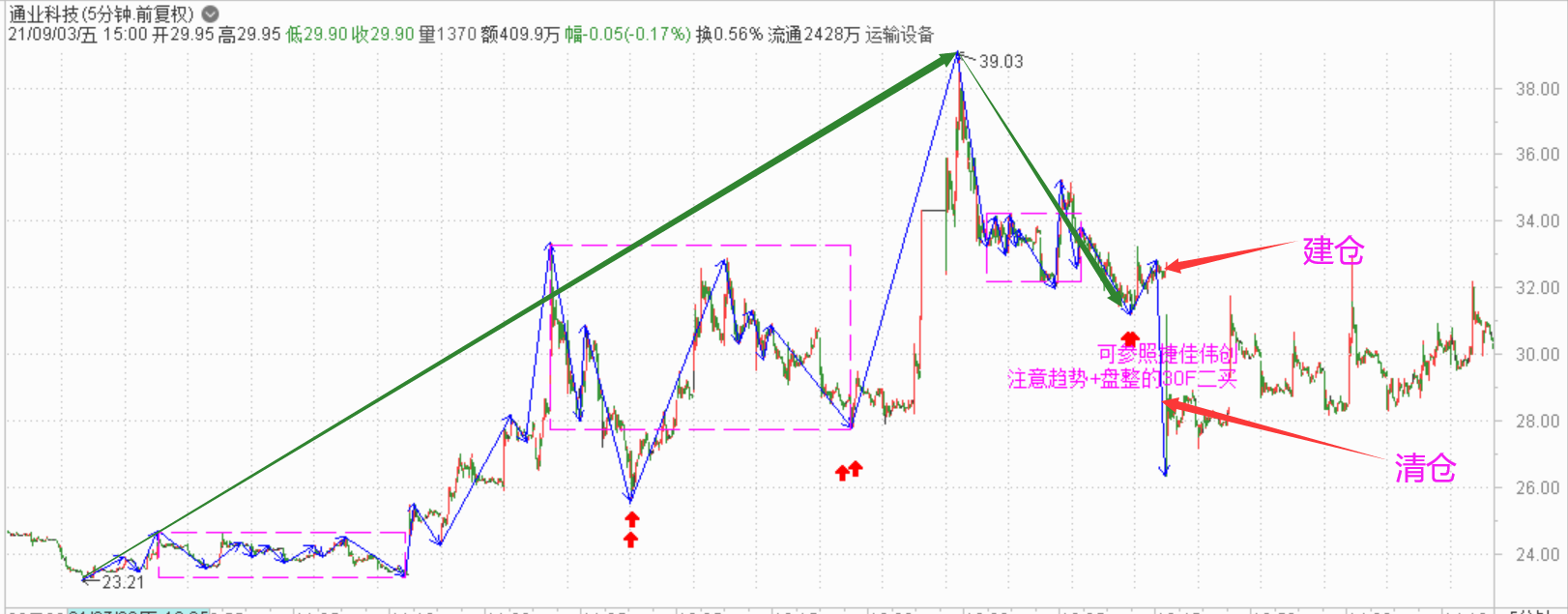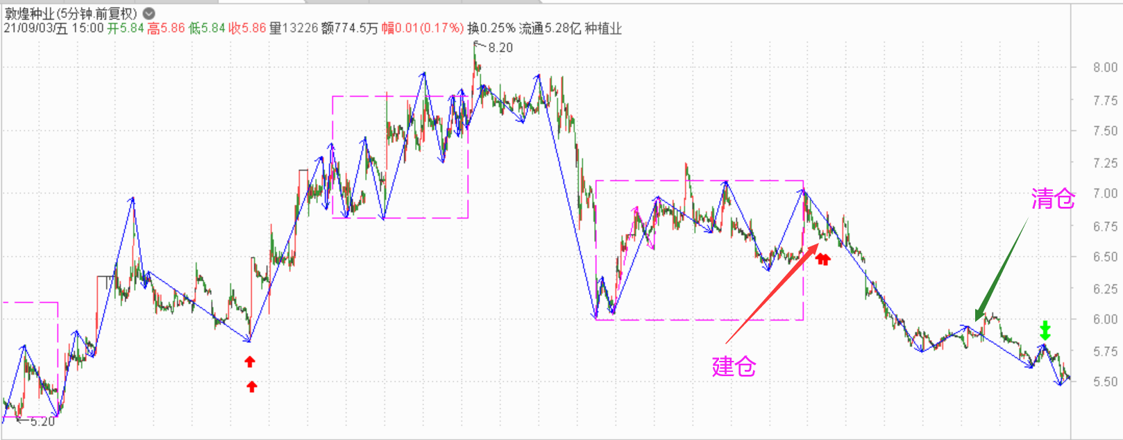 现在来看,无论五分钟还是30分钟的中枢,如果中间有不一样的高点,就要想到走势反转的可能性。敦煌这个买点这里,下行5F中枢第一次构建出来,明显是个五分钟的二卖,后面的跳水就理所当然了。