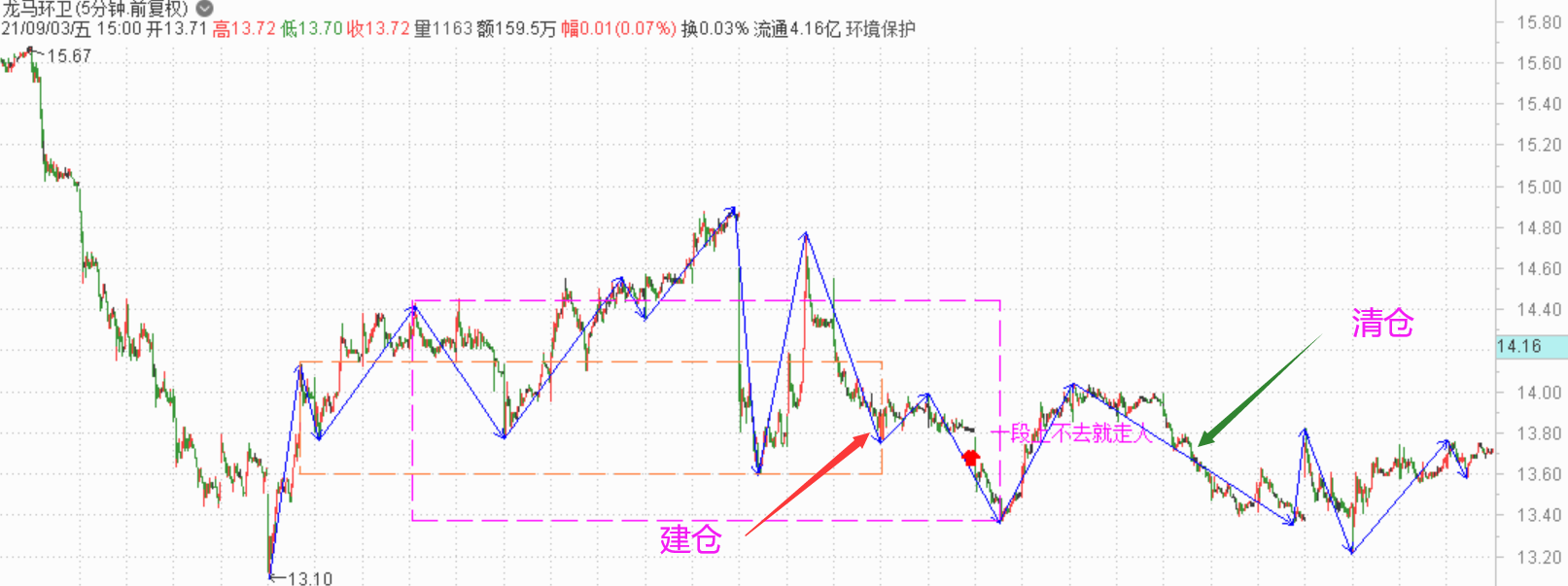 从底部起来5F分扩展中枢完成后向上的离开段,进入时机没问题。问题出现在第三天,开盘后,向上拉升后随即开始跳水,而我无视盘整背驰的走势,总想着会拉起来,眼看着浮盈变浮亏最后变成大幅度亏损。后面出现三卖后依然不醒悟,想着处于中枢下沿,有可能拉回去,最终跌破中枢后割掉了,亏损14%。