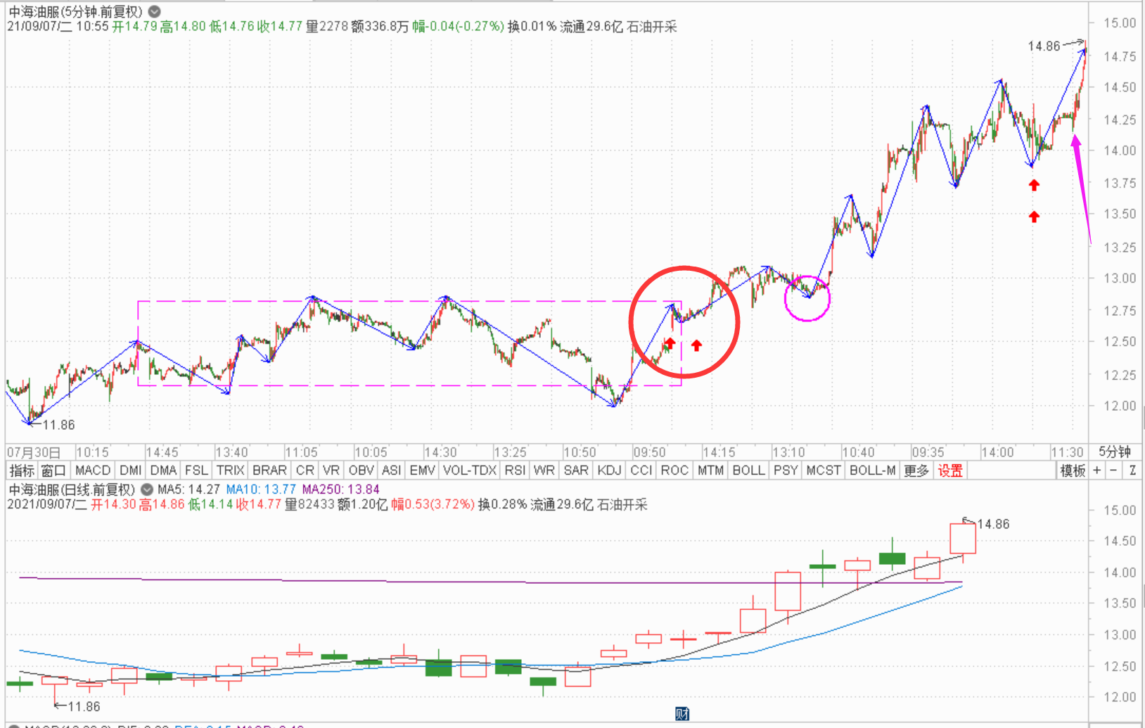 中海油服昨天回踩年线,同时形成了五分钟扩展三买点。这个买点是按照定义出发的,由于前面都是线段类趋势,所以这个买点可以后移两段。这个买点是昨晚复盘发现的,所以想着今天回调的话就在第二个分类的买点介入。但是今天开盘它只是稍微下探了一下,然后就直接向上突破了,根本不去形成第二个分类的买点。