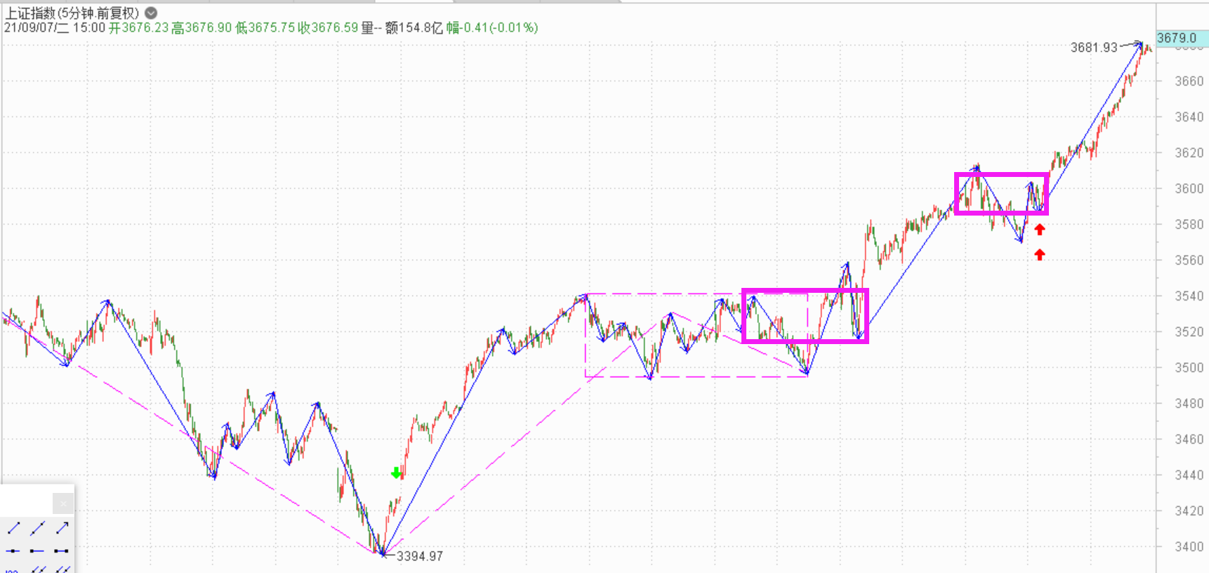 今天上证全天上涨,结构上依然是昨天向上线段的延续。现在的走势已经是一分钟的趋势上涨,并且不背驰,五分钟的盘整背驰也已经打破。由于当前的位置接近3700,明天可能会震荡出来第三个一分钟中枢了,然后后面就是扩展为五分钟的。由于3731是近七八年的高点了,这里基本不会一次突破,所以这个五分钟扩展中枢要么在3700附近横盘形成,然后一根大阳线突破;要么就是以一分钟的走势直接突破,然后趋势背驰再跌回来形成5F中枢,至于是哪种,看指数的选择了。