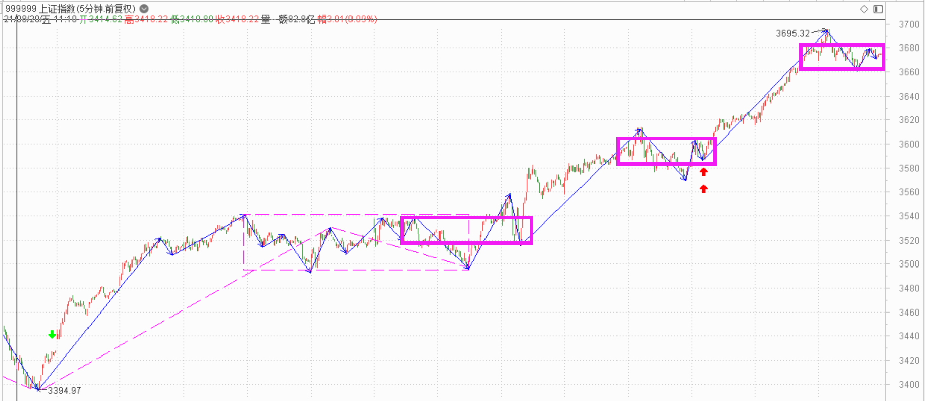 今天指数休息了一下,完成了一个一分钟中枢的构建,现在这波上涨已经三个一分钟中枢了,上面就是近六年的高点3731,明天要不要尝试突破一下呢?从七月底到现在的这波上涨,有个很奇怪的现象就是,上证迄今为止还没有出现过两个点以上的涨幅,下跌倒有。虽然指数整体上已经上涨了十来个点,但都是小阳线。明日如果能上涨超过两个点,将直接突破年内高点,倒是一个吸引人气的好方式了。