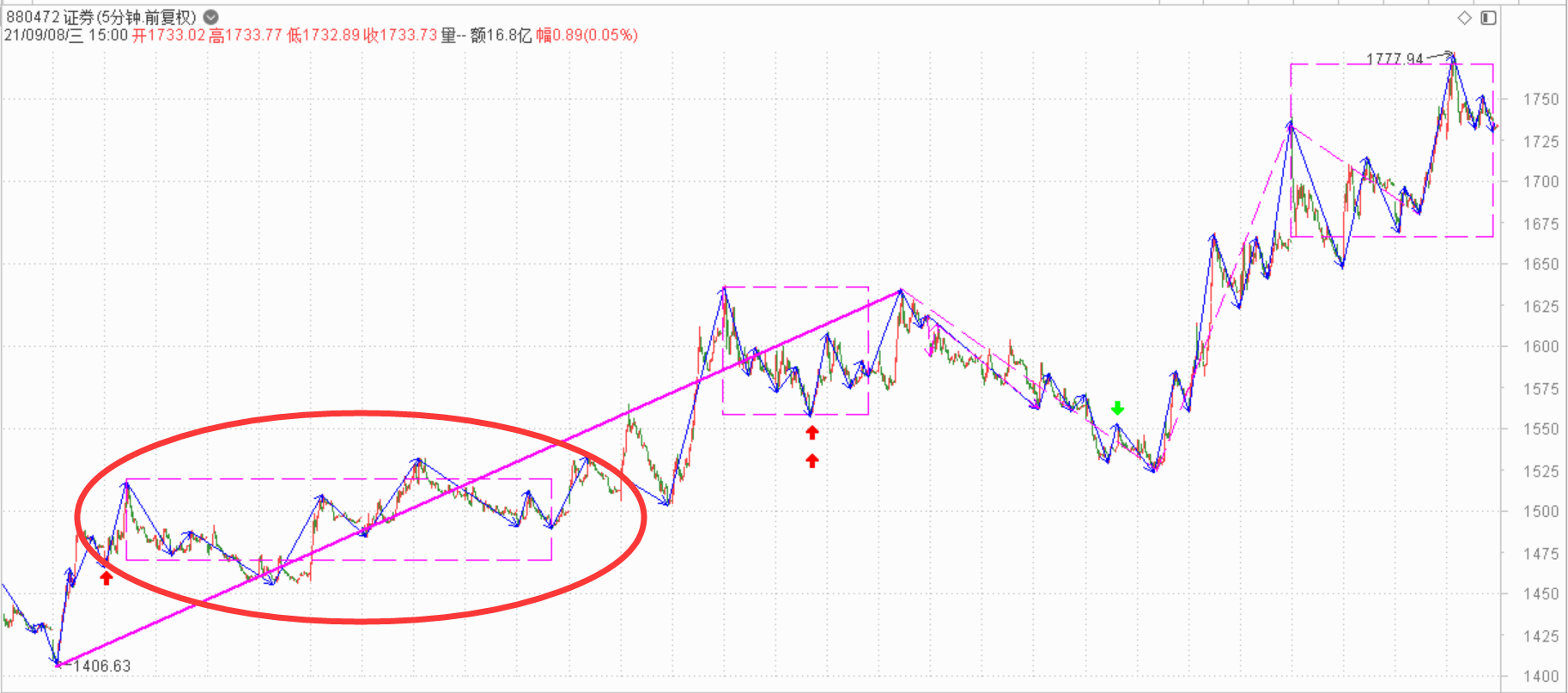 固定思维害人啊!以后要注意,5F中枢构建过程中,如果没有好的盘整背驰买点就罢了,如果有,那就务必先进去。这种脱离30F中枢的,构建5F走势的概率超过90,即使失败,也可以第二天走人嘛,况且还存在不构建中枢直接上涨的情况呢?这个周末总结的时代新材就是这个情况,看了教训还是不够。