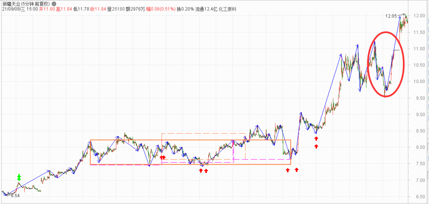 新疆天业,前面的五分钟一买点没能参与上,后面的30F扩展买点由于仓位安排的原因再次错过,最后的5F三买没敢参与,拉升之后,想着第一个5F中枢扩展的时候无论如何要参与一下了。前天收盘,第一个5F中枢构建中,盘整背驰,这个点看到了,但是总想着5F扩展之后再参与比较保险,于是放弃了,结果第二天直接涨停,今天又是接近涨停,它不进行扩展了!