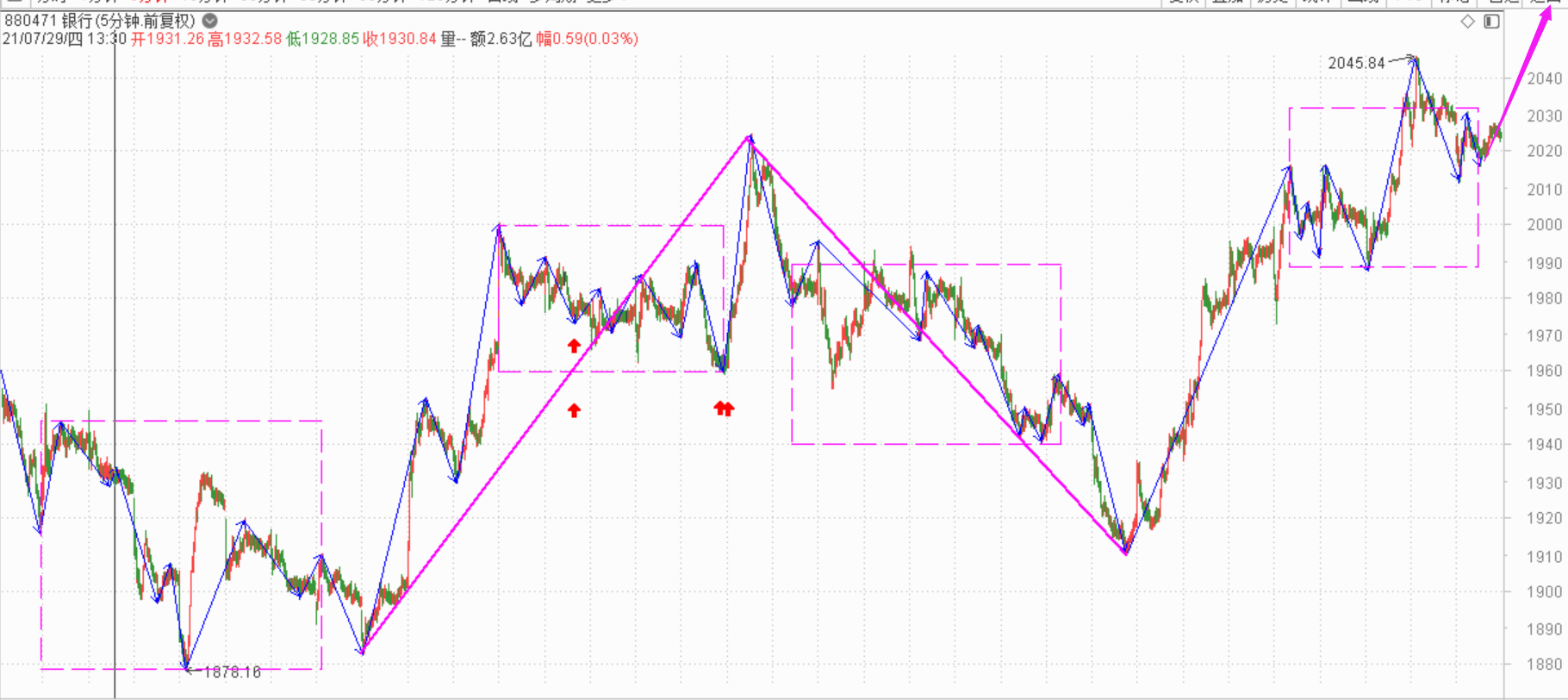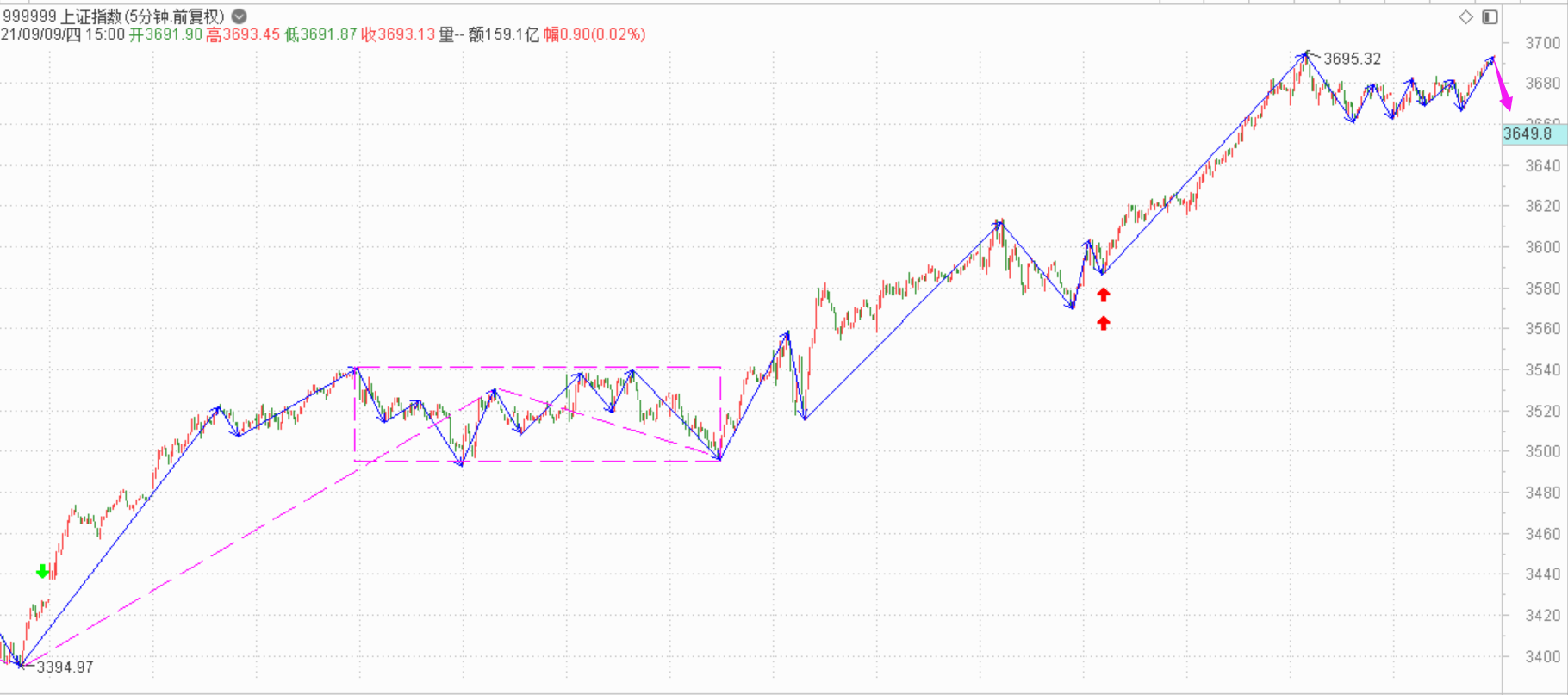 一旦中枢完成,这波上涨就确定为五分钟趋势上涨,后面的操作上也就更明确一些。如果向上,那就等待后面出现的5F三买点,然后再判断会不会出现趋势背驰,由于前面这段一分钟的趋势涨幅近两百点,所以要想趋势不背驰,那么这里的离开段涨幅至少要超过两百点了,如此后面就是狂欢的日子了。反之,指数选择方向向下的话,在跌破中枢下沿的时候就根据个股的情况减些仓位,因为这种高点,如果等三卖的话,不一定跌到哪儿去了。