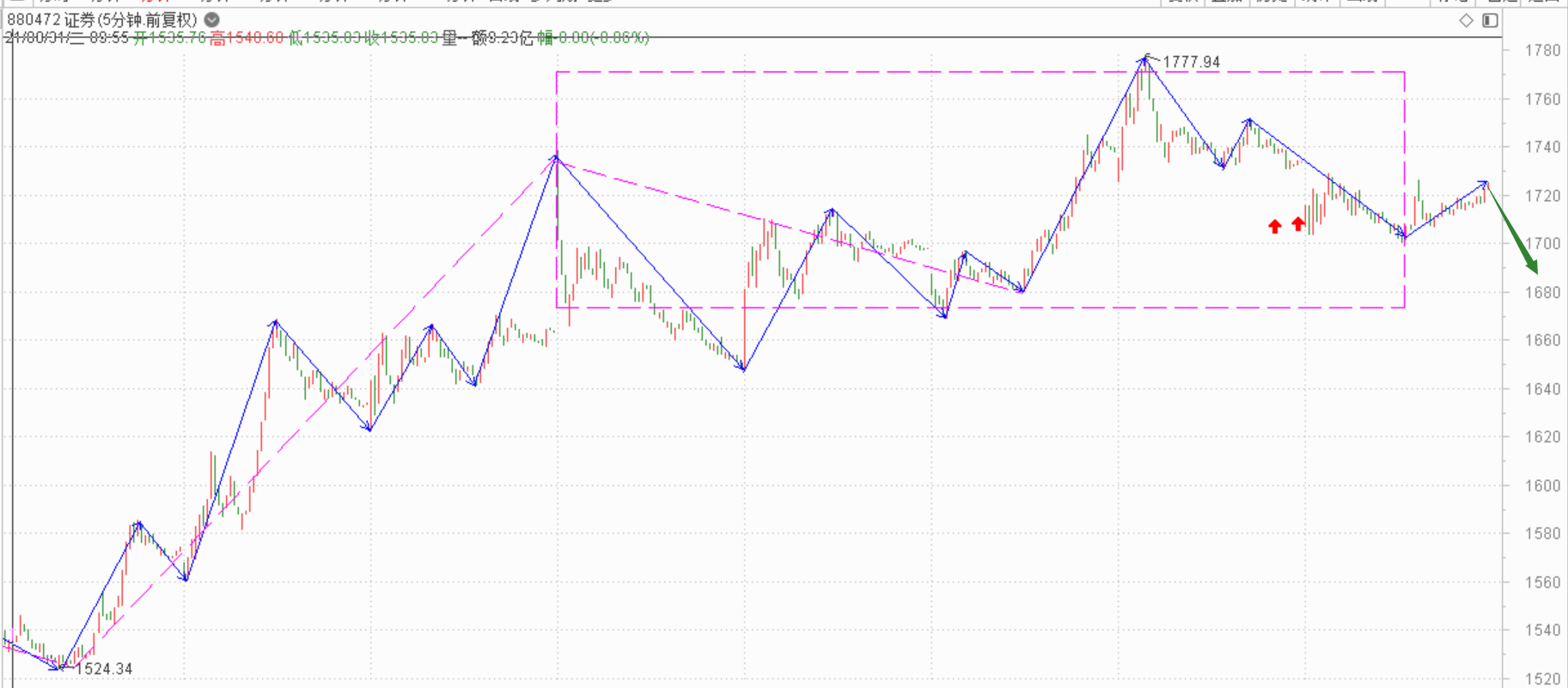 昨天在上证完成第三个1F中枢的时候,想着今天如果走向上的离开段的话,那么大概率是个大阳线,发动的主力就是证券。但是今天开盘就昭示这个希望落空了,因为证券大幅度低开。不过有意思的是,前几天上证指数走的,三天出现一根线段,而今天的震荡竟然是一天出现了三根线段,所以明天早盘向下一笔后,上证的第二个5F扩展中枢就完成了。