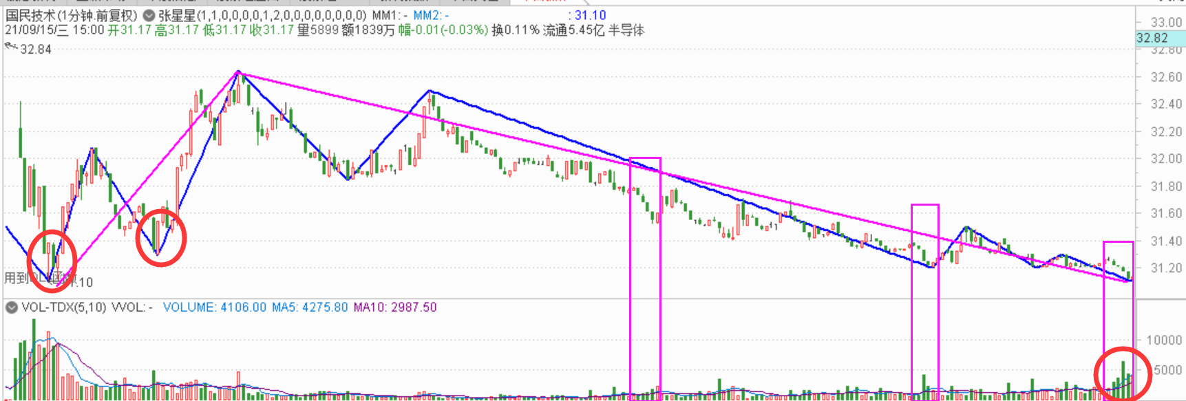 先看国民的,开盘的下探,最低的那个倒T线,成交量非常大,所以这里大概率是底部,并且这里下跌幅度五个点,接近中枢下沿。可以在后面一根绿柱处介入,然后等待向上一个线段的完成。