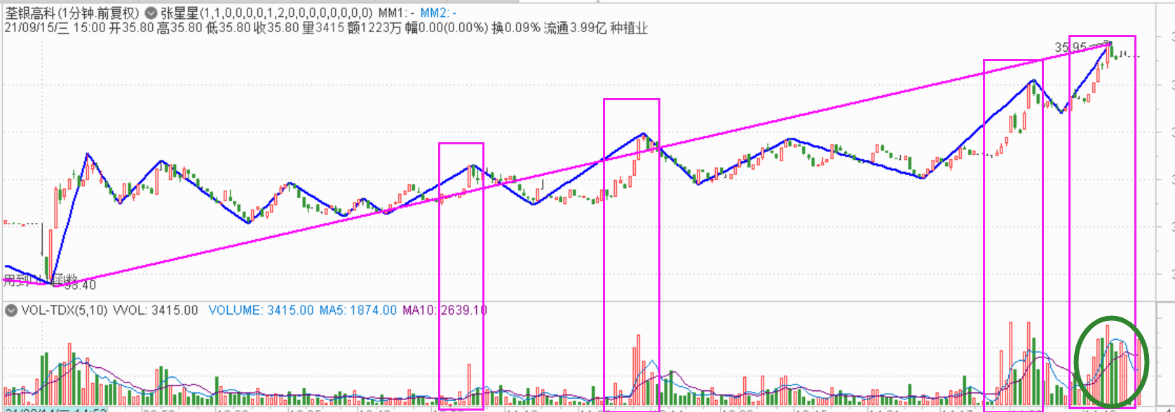 首先在出现一分钟线段之前,涨跌都不用考虑。在第一个一分钟线段完成后,那笔大幅度的拉升,力度和幅度正相关,就是量价不异常。第二笔拉升的时候,最后一笔34.99这里,明显量价异常,所以这里是一个小级别卖点。但是这里还要注意,由于这个位置的成交量高于前面,所以后面除非完成一笔向下线段,如果向图上所示,两次下跌都没能完成向下线段,再结合今天种子板块的强势,证明向上线段没完,卖掉的还需要补回来的,等它下次异常才行。