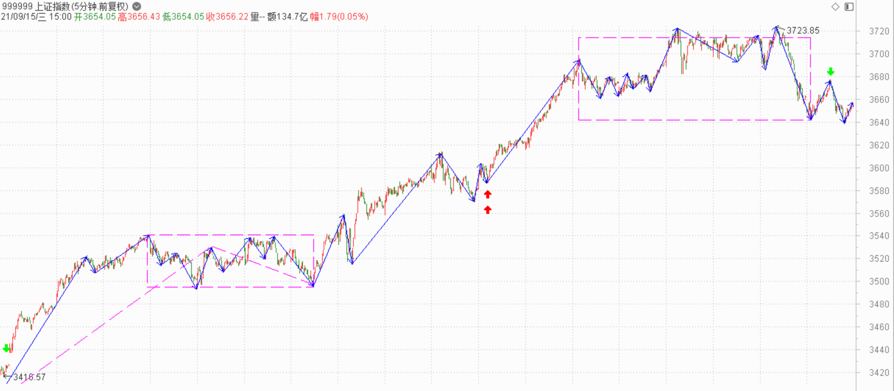 后面向下线段的补仓,注意一定要是最后离开段,否则没意义,并且注意,三笔下跌的,如果第三笔相比第一笔没有背驰,那就等待第五笔,今天就是。今天的下跌线段,跌破第一笔后,后面两次绿柱的急跌,都没有发生量价背驰的现象,证明这里并不是底部,直到收盘前,这里绿柱明显异常,最后一根大绿柱,但是成交量只有前面小绿柱的一半多一点,显著异常,并且这里还是五段下跌的第五段,所以这才是真正的低点。