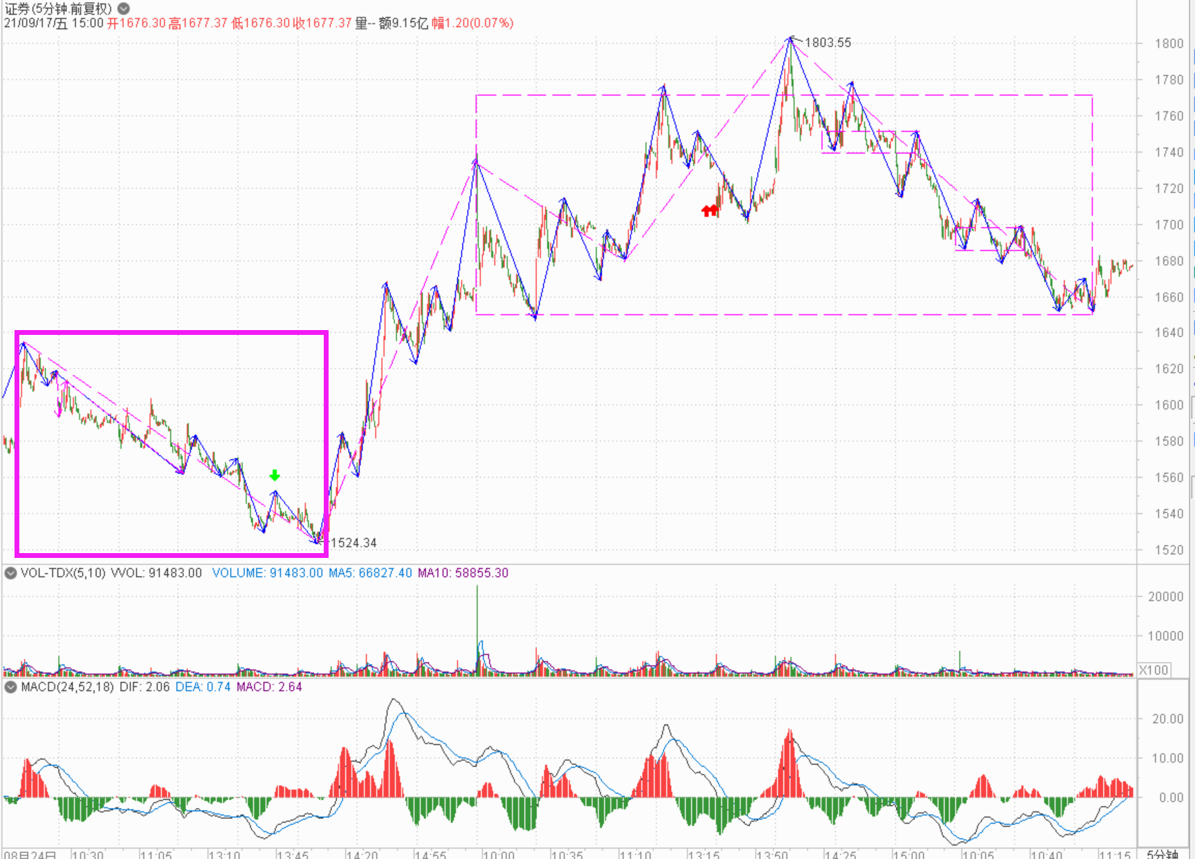 如果以上次证券一分钟的背驰为参考,左侧框图中就是那次的背驰,后面的上涨直接一个一分钟的盘整走了两百点。结合现在证券的结构,目前是一个五分钟的标准中枢刚刚构建完成,一般来说后面要有一个一分钟的离开段,并且有较大概率新高,当然这都需要指数的配合。后面证券的操作上,如果出现线段盘整背驰,可以考虑把今天加的仓位减掉;如果是大幅度上涨,在出现一分钟中枢前就不要减仓了。